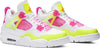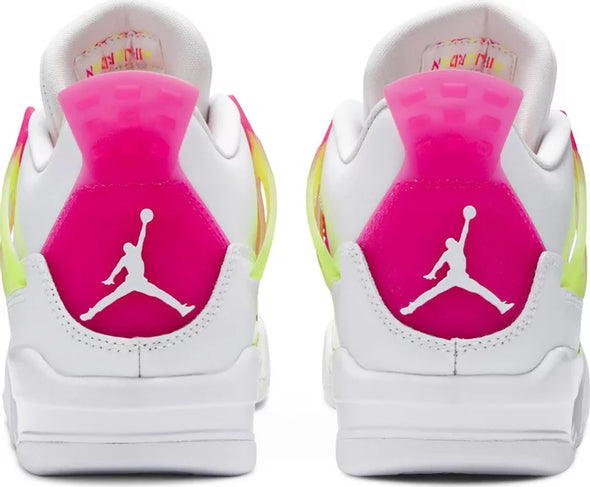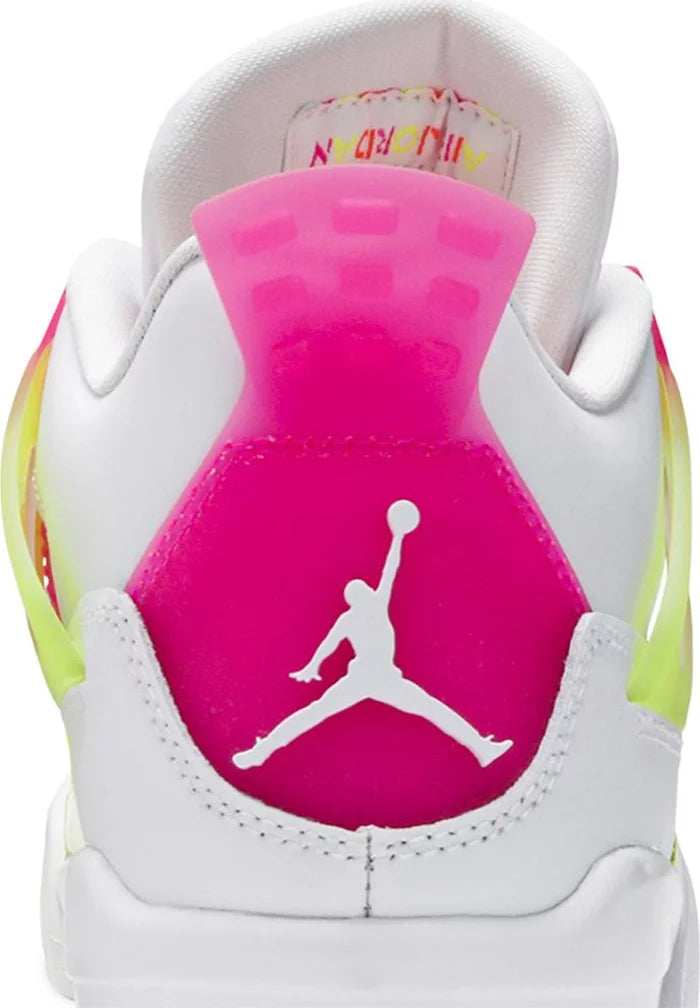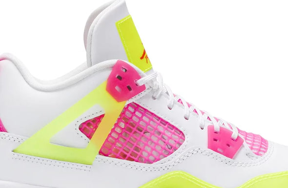 Made for big kids and ladies, the Air Jordan 4 Retro GS ‘Lemon Venom’ updates Tinker Hatfield’s 1989 design with candy-bright accents. The white leather upper is treated to increased ventilation, thanks to open quarter panels covered in pink netting. The same vibrant hue is repeated on the molded eyelets and heel tab, embellished with Jumpman branding. Contrasting pops of Lemon Venom land on the semi-translucent wings, forefoot overlay and tongue tag.