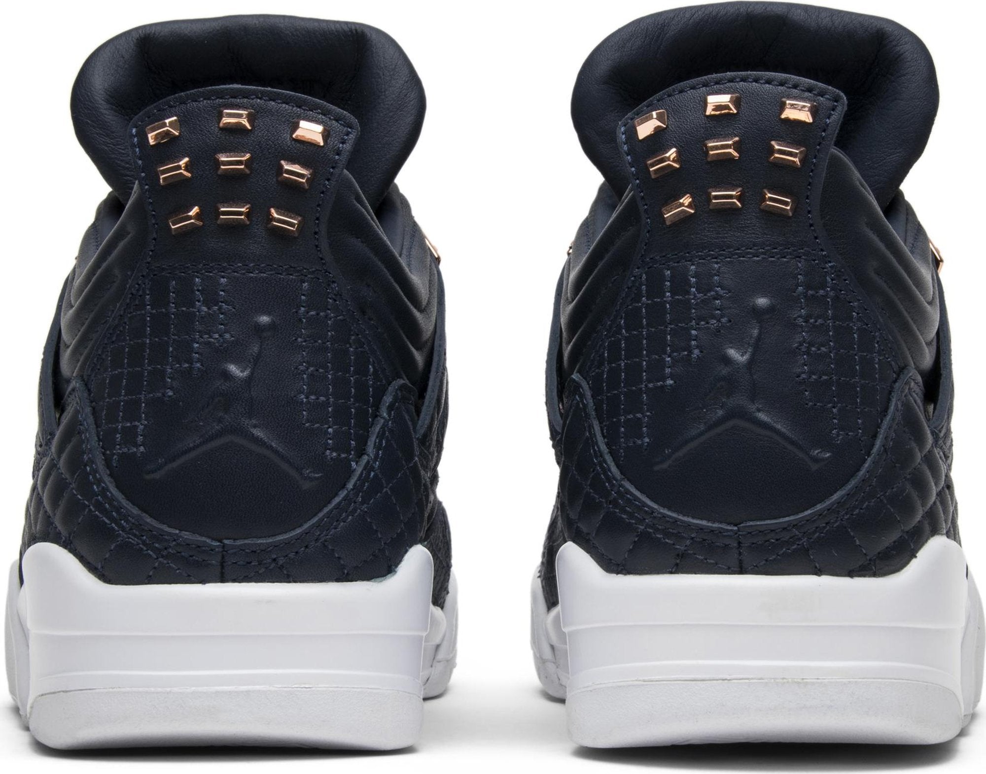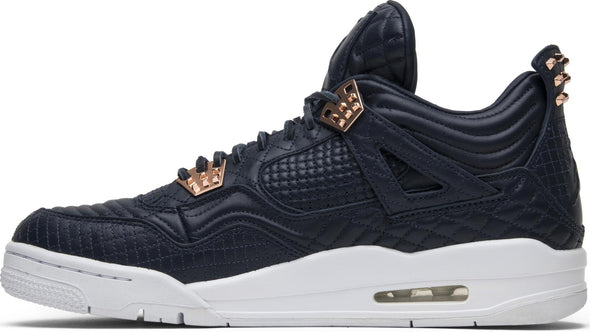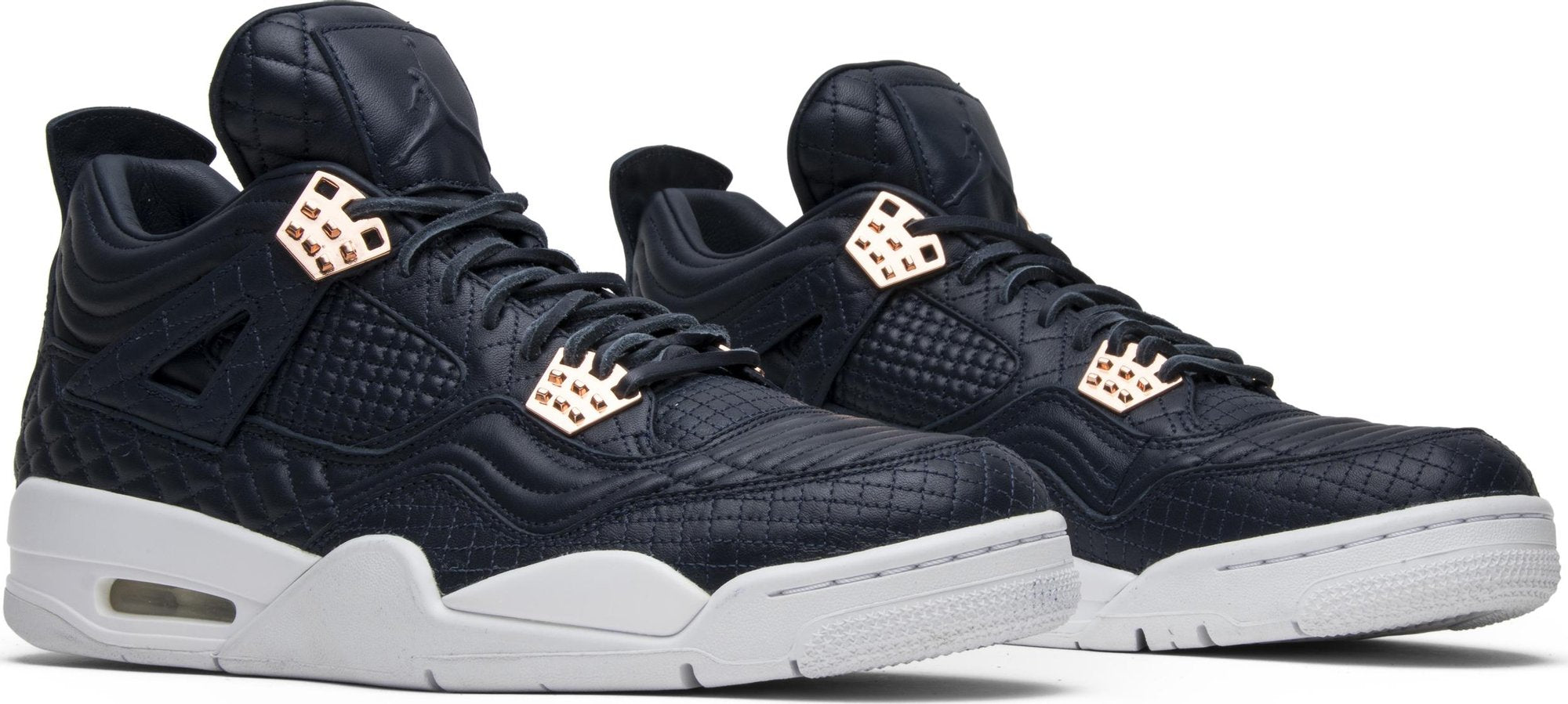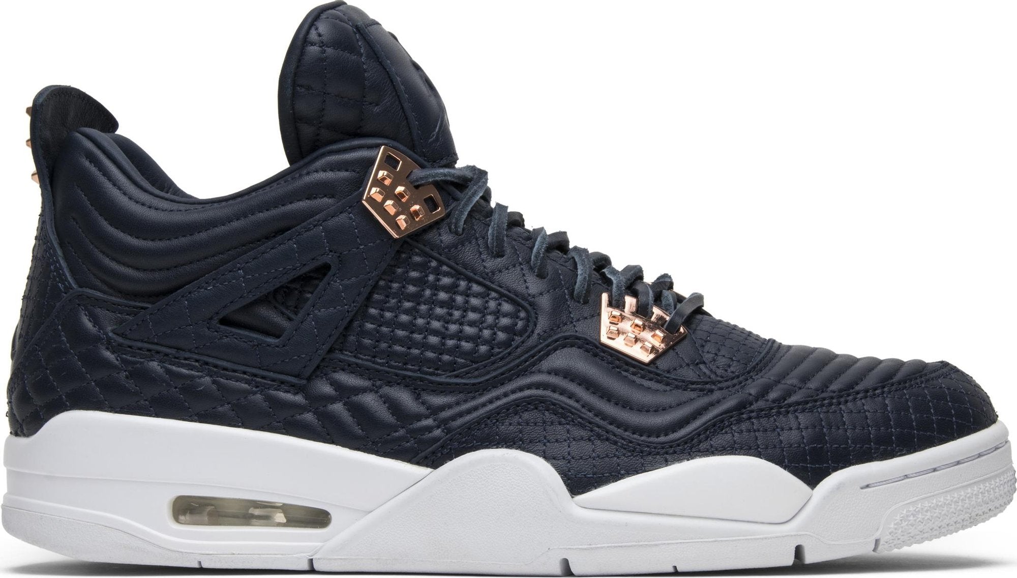 The Nike Air Jordan 4 Retro Premium 'Obsidian' features an Obsidian quilted leather upper, waxed laces, all-white sole, and an embossed Jumpman at the heel. Released in September 2016, the sneaker also includes metallic gold lace eyelets and heel studs.