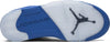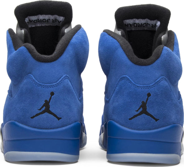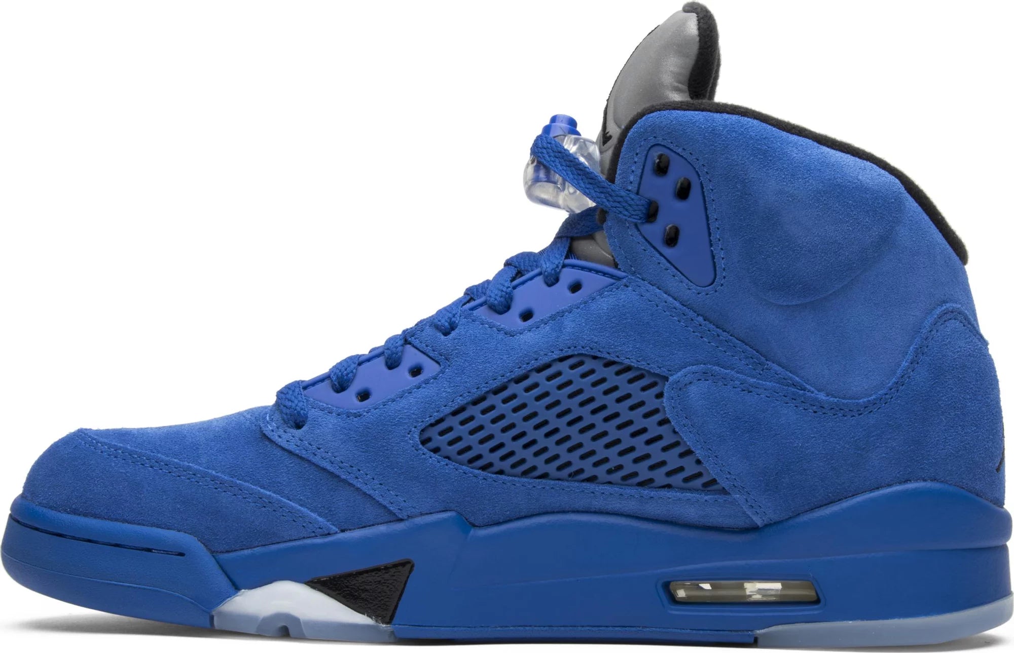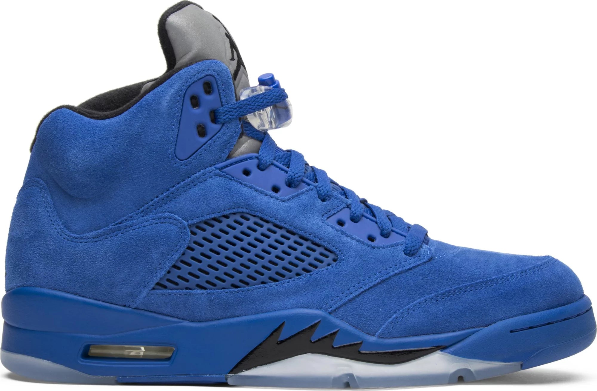 Inspired by the flight suits worn by Michael Jordan during the original Air Jordan campaigns, the Air Jordan 5 Retro 'Blue Suede' features a Game Royal suede upper with black shark teeth at the midsole. Released in September 2017, the Air Jordan 5 Retro 'Blue Suede' joins the previously released 'Red Suede' colorway as part of the 'Flight Suit' pack.