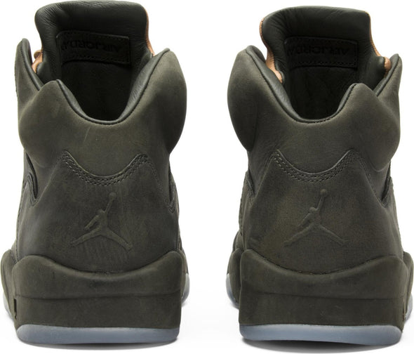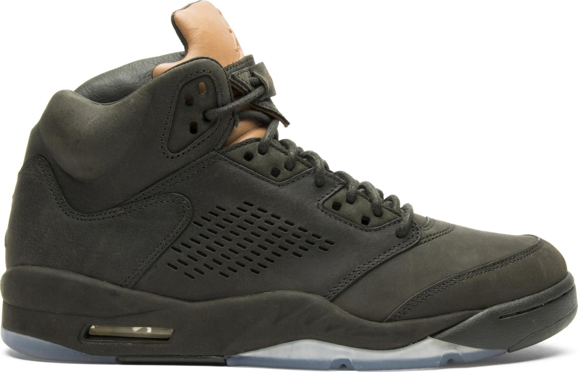 Based on the P51 flight bomber jacket, the Nike Air Jordan 5 Retro Premium 'Take Flight' features a Sequoia premium leather upper with a Vachetta Tan leather tongue and leather lace-locks. The sneaker comes with a special shoe bag featuring the fighter jet graphic that inspired the 'shark teeth' midsole. Released in February 2016, the 'Take Flight' pack also included a Sequoia Air Jordan 8, and an all-black stealth fighter jet-inspired Air Jordan 15.