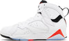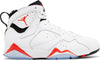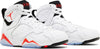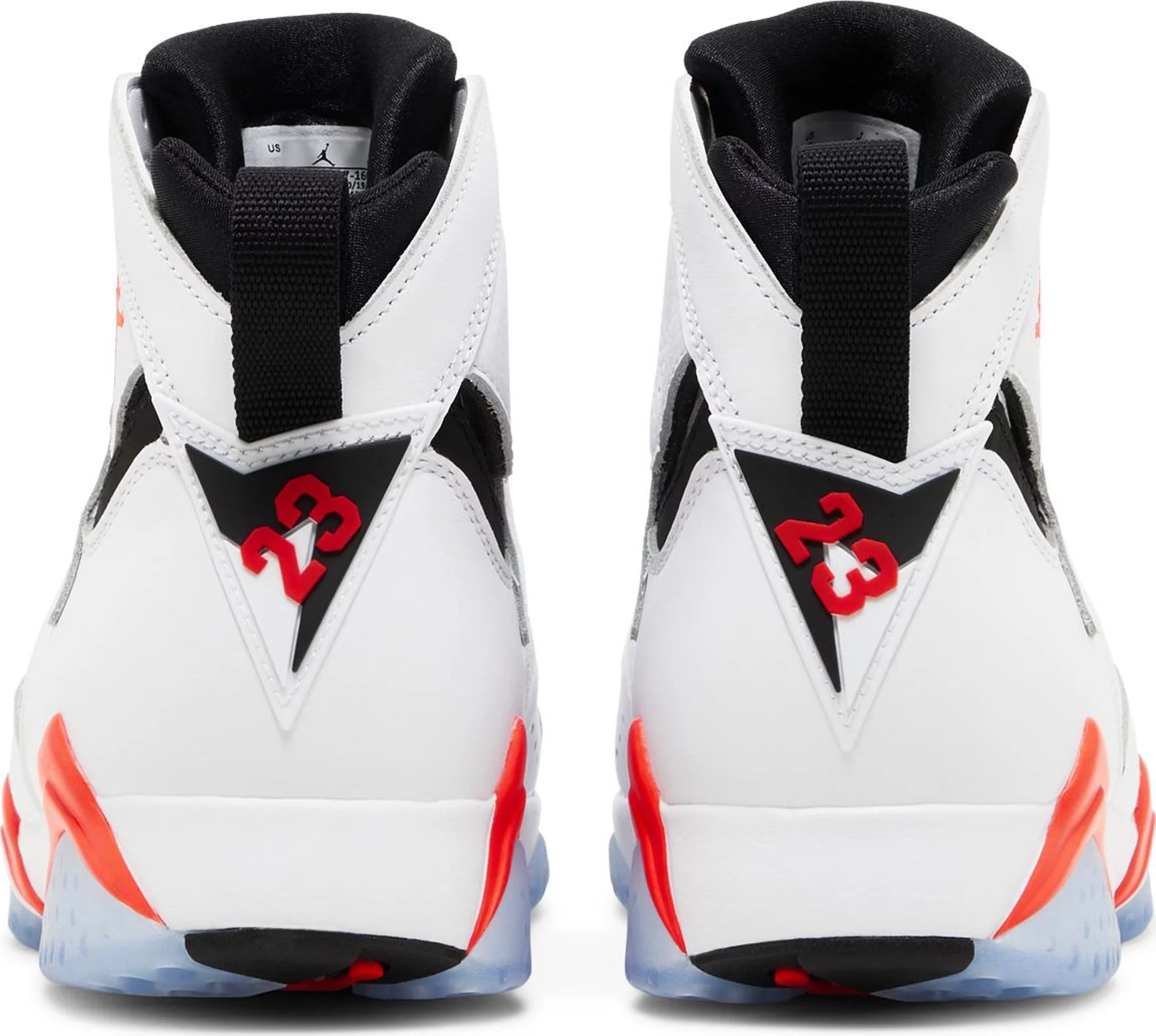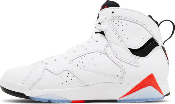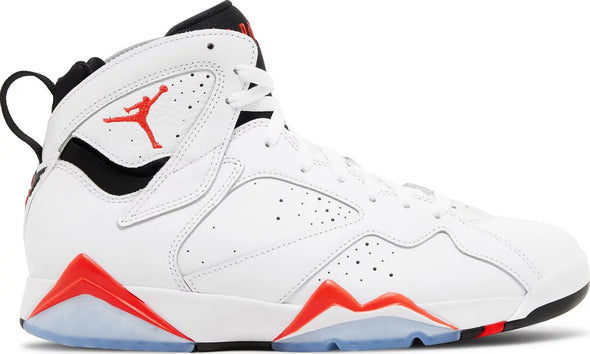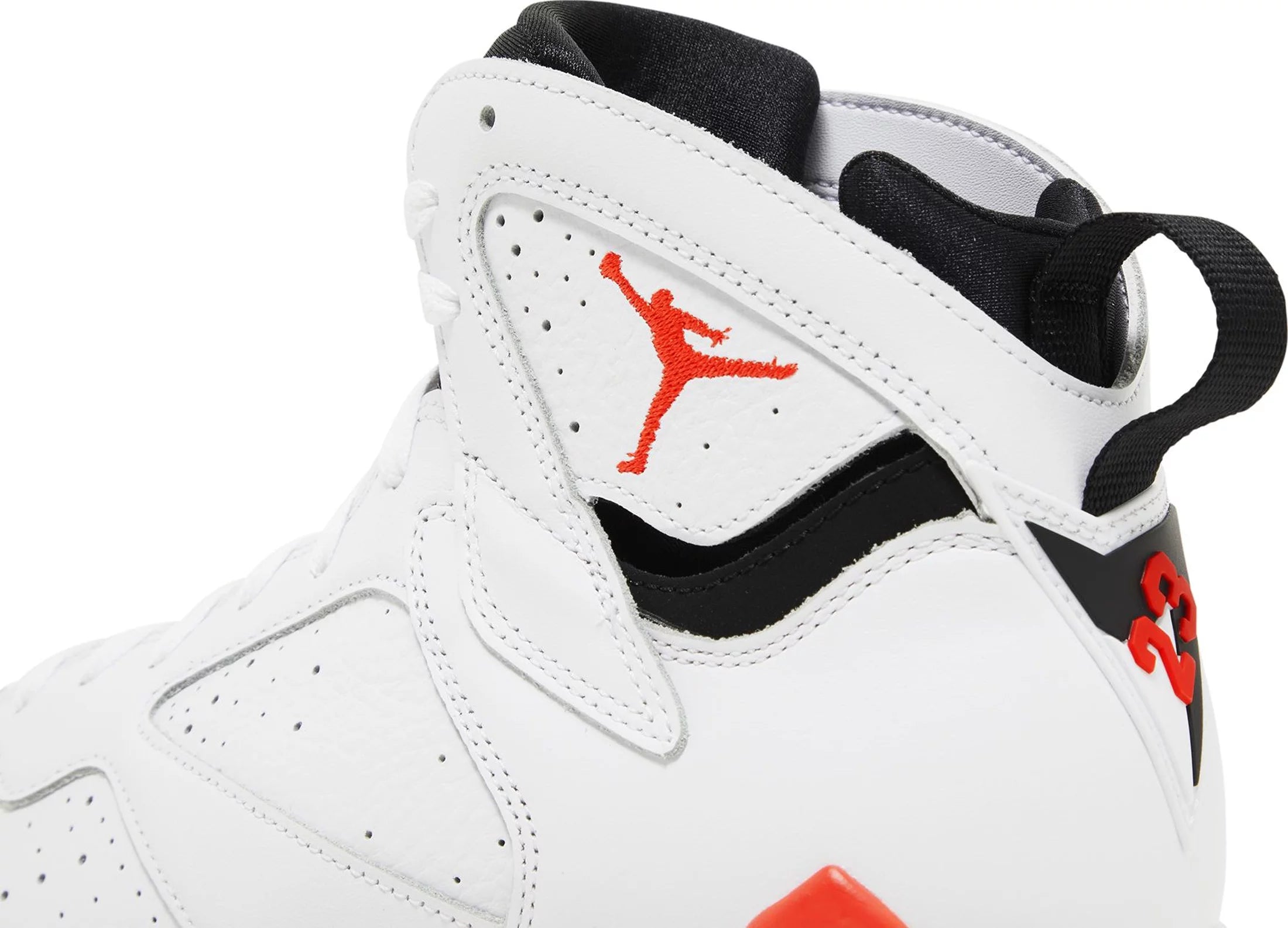 The Air Jordan 7 Retro ‘White Infrared’ showcases a familiar OG color scheme initially seen on the Air Jordan 6. The layered upper is crafted from white leather with perforated detailing throughout the midfoot and collar. The latter is marked with an Infrared Jumpman logo on the lateral side, matching the ‘Air Jordan’ lettering that embellishes the stretchy neoprene tongue. A molded ‘23’ patch decorates the heel, while classic Nike Air branding appears on the sockliner. Lightweight cushioning is provided by a white polyurethane midsole, accented with Infrared detailing and reinforced by a translucent rubber outsole.