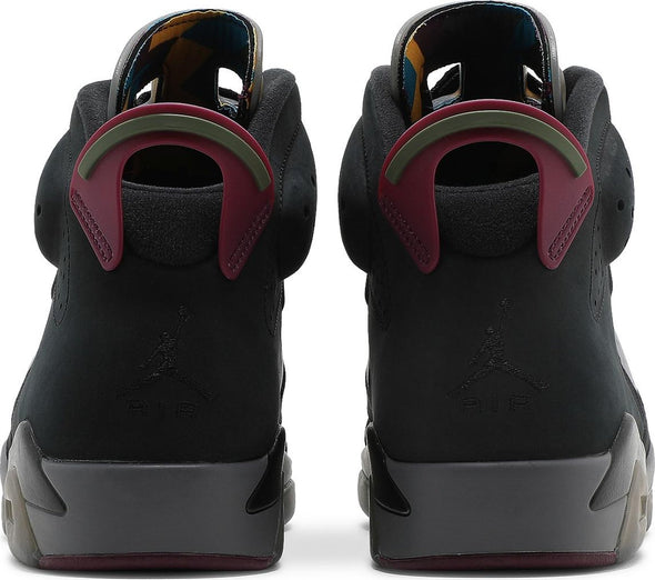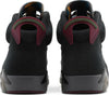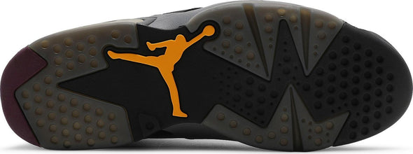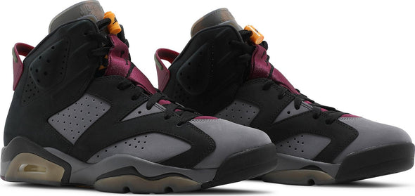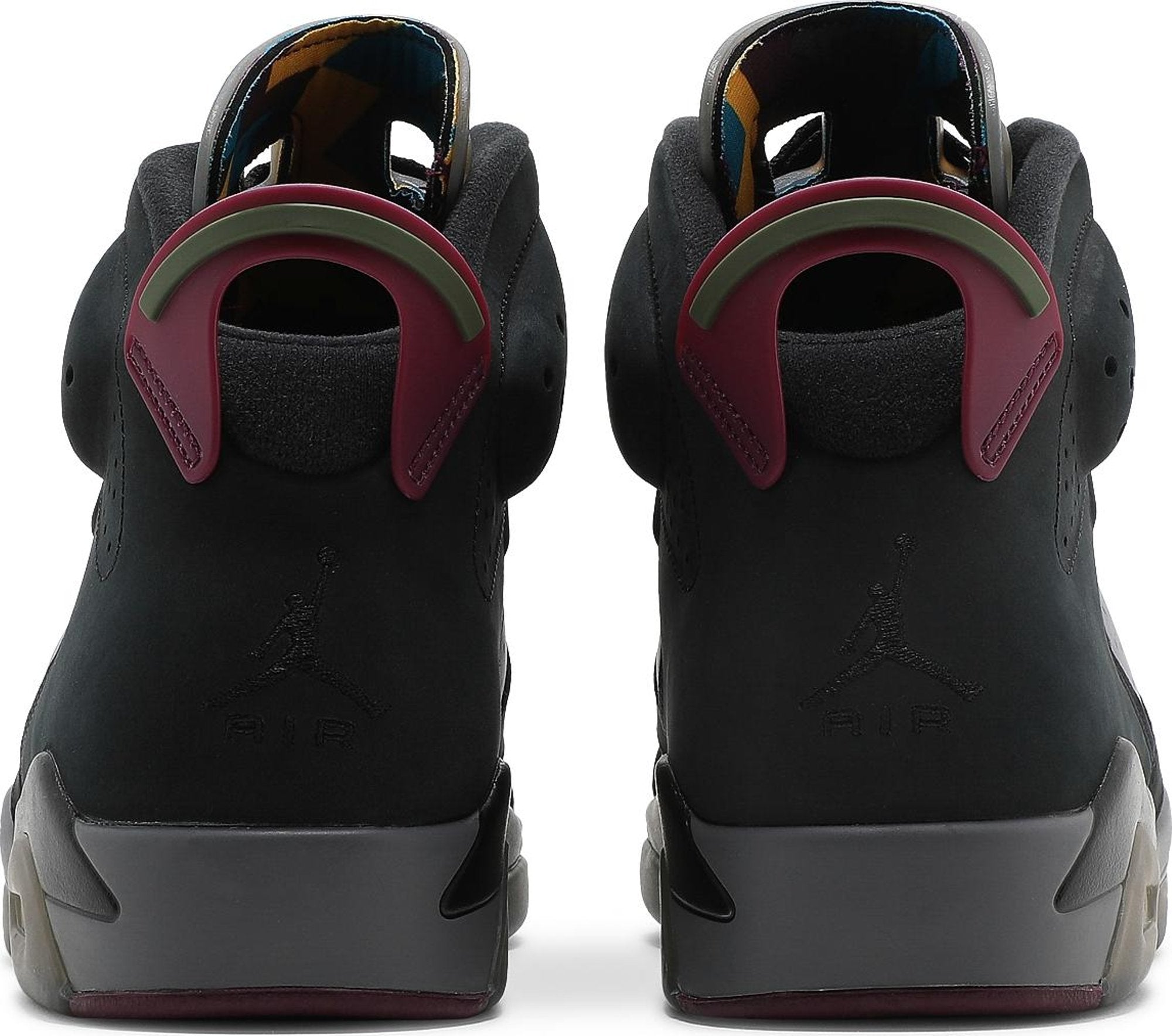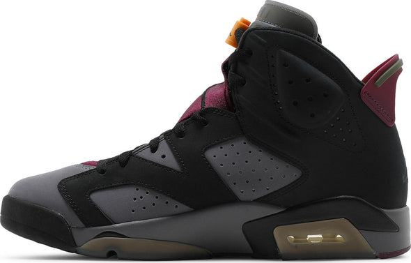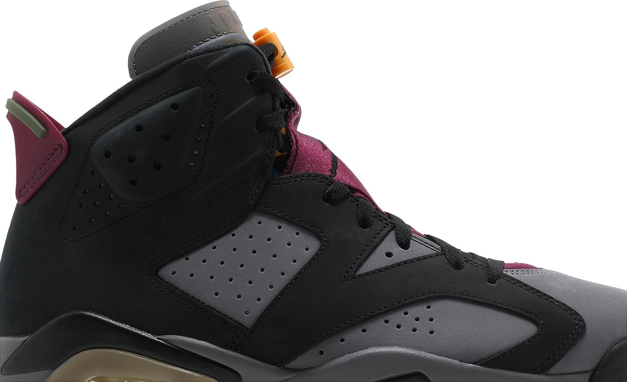 The Air Jordan 6 Retro ‘Bordeaux’ takes on a familiar color scheme tied to the shoe’s successor, the Air Jordan 7. Soft nubuck construction is utilized on the upper, featuring a neutral grey base with contrasting black overlays. The translucent tongue features a multicolor print that replicates the look of the AJ7’s neoprene tongue, while Bordeaux accents land on the throat and molded heel tab. Lightweight cushioning arrives via the visible Air-sole unit nestled in the heel of a grey and black polyurethane midsole.