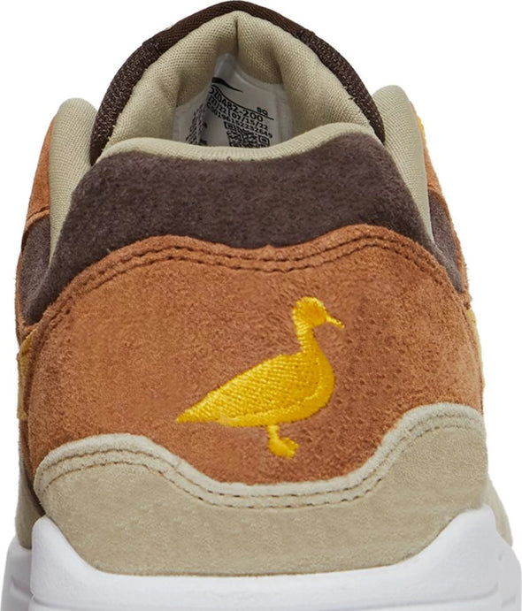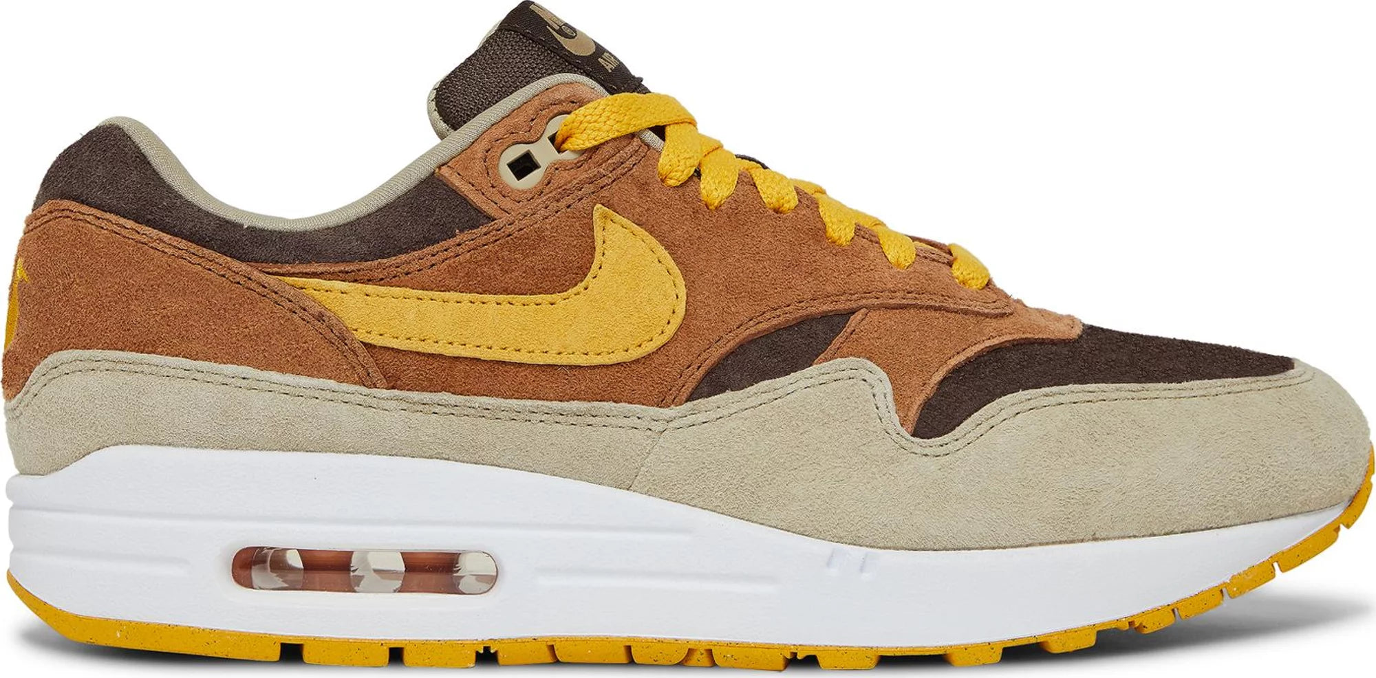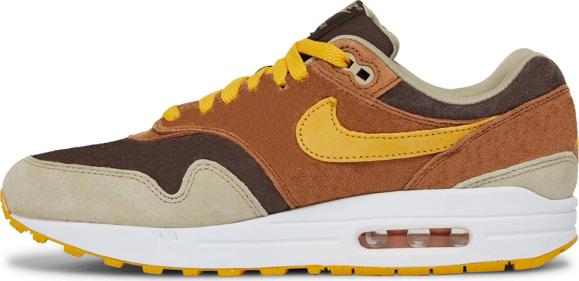 The Nike Air Max 1 Premium ‘Pecan’ features premium materials on a classic running silhouette. This pair features full suede construction in muted earth tones, featuring a Baroque Brown base, light brown overlays and a beige mudguard. Yellow Ochre accents land on the laces, signature Swoosh, and a duck graphic embroidered on the heel. Lightweight cushioning arrives via a white polyurethane midsole with an exposed Air-sole unit nestled under the heel.
