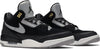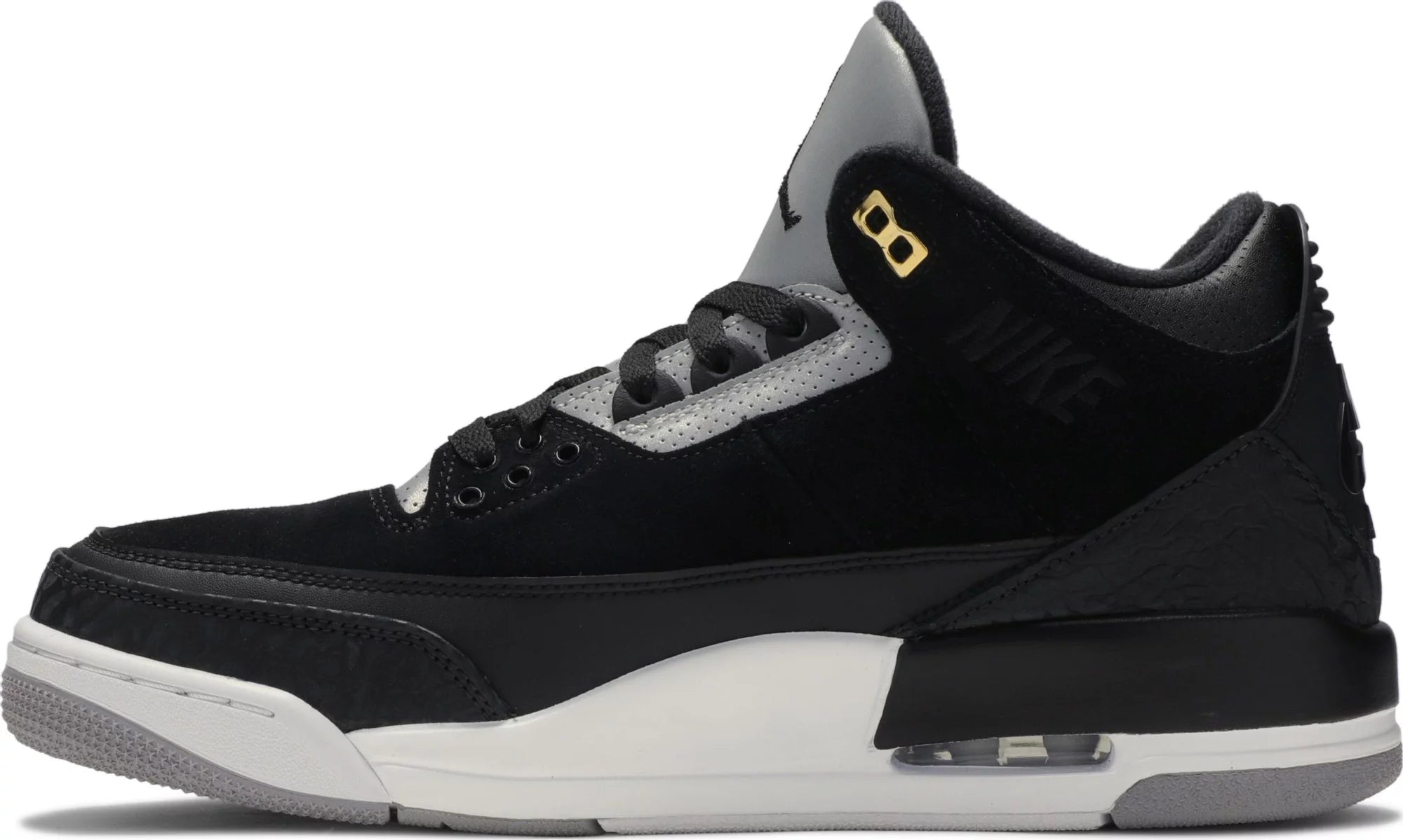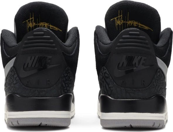 Unveiled in July 2019, the Air Jordan 3 Retro Tinker SP 'Black Cement' is a modern spin on Hatfield's original sketch of the silhouette. The legendary template is updated in a bold mix of suede and leather, with a Nike Air branded synthetic heel piece and the iconic elephant print touching up the toe guard and heel counter. 3M reflectivity is utilized on the Swooshes and perforated panels. Returning underfoot are the classic visible Air unit and rubber outsole.
