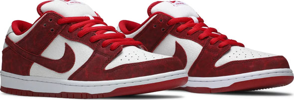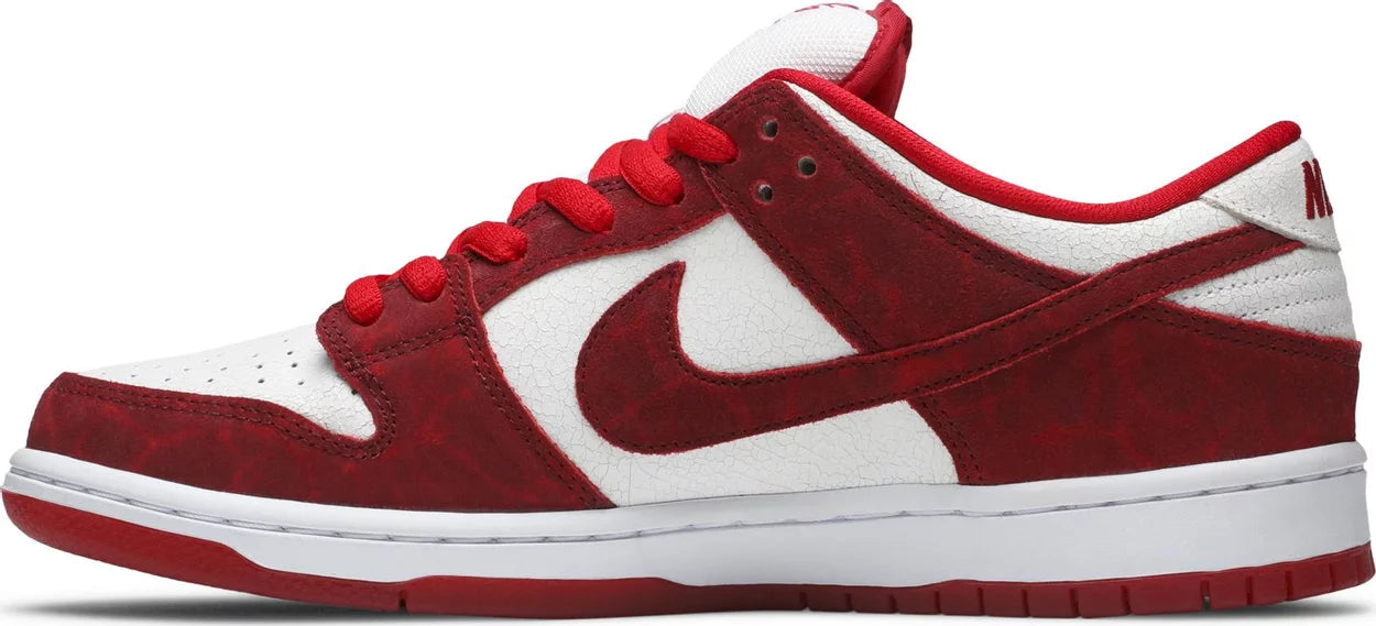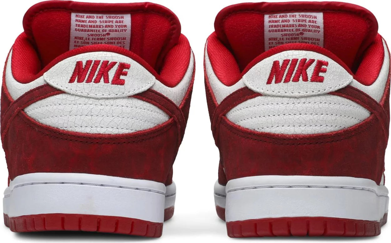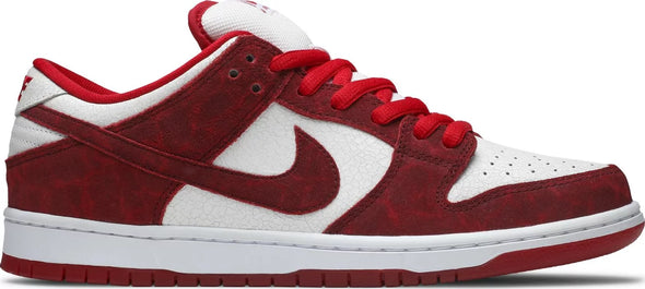 Dressed in a color scheme reflective of its release date, the Nike Dunk Low Premium SB 'Valentine's Day 2014' sneaker updates the 80s classic with modern style. Dropped February 14, 2014, the two-toned shoe is constructed with soft suede leather with contrasting smooth overlays. This low-cut version of the 1985 basketball shoe is completed with tonal laces, Swooshes and outsole to complete the holiday-inspired design.