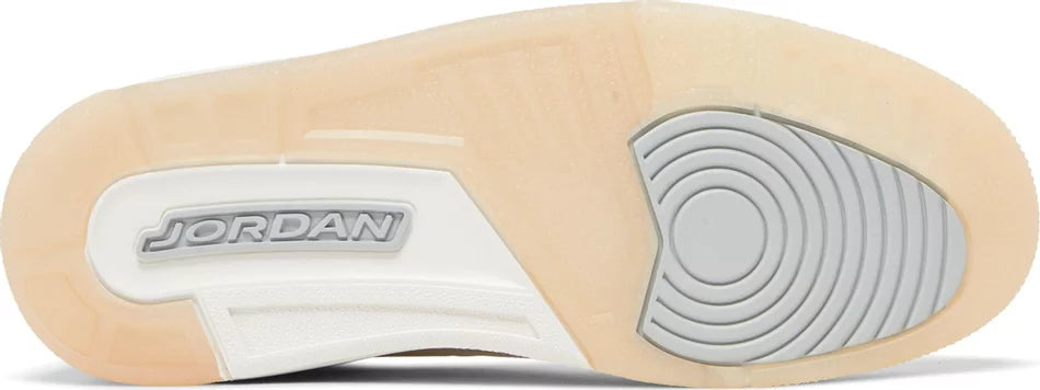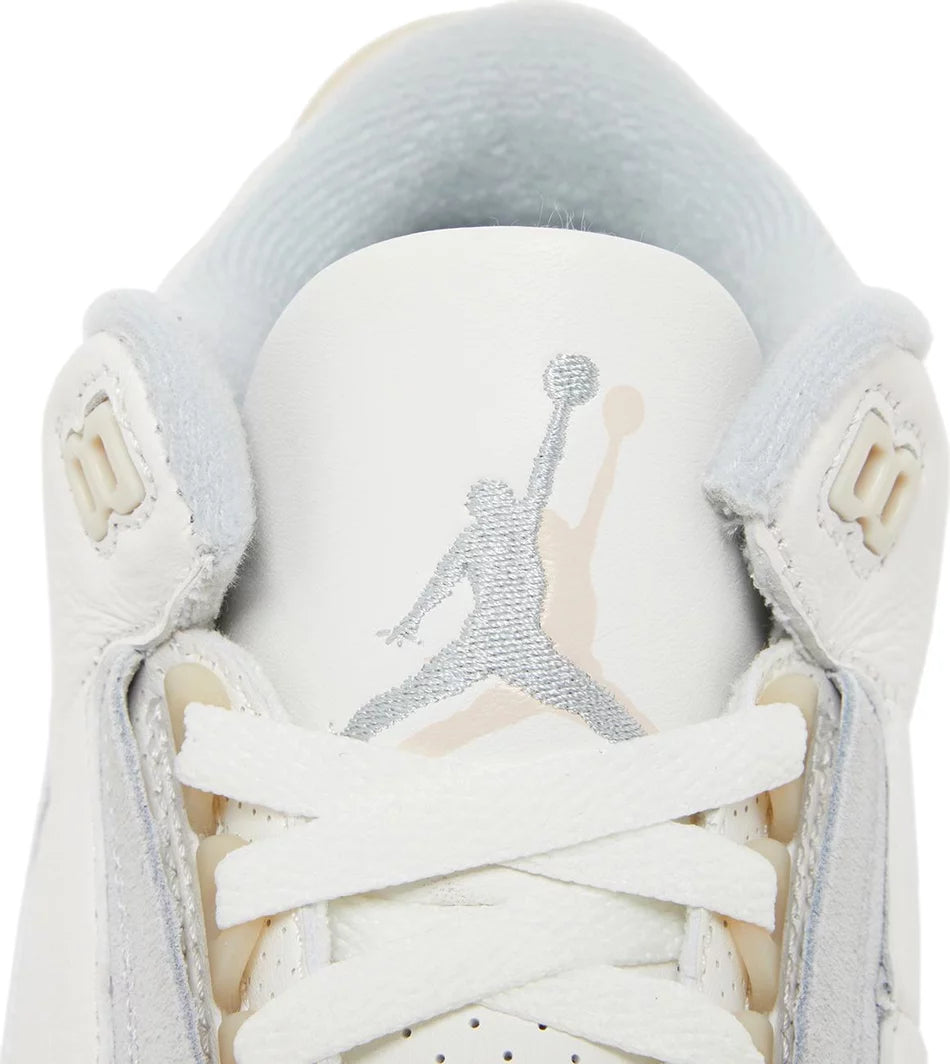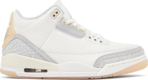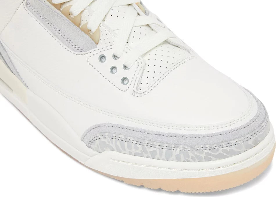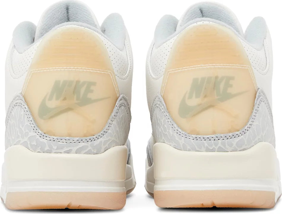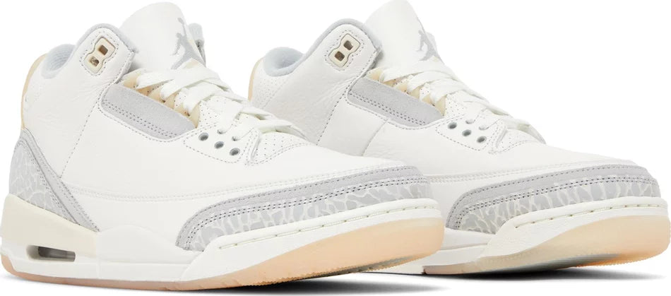 The Air Jordan 3 Retro SE ‘Craft’ in ‘Ivory’ showcases a white leather upper with grey elephant print overlays at the forefoot and heel. A double-exposed Jumpman decorates the tongue, while a semi-translucent heel tab displays tonal Jumpman branding atop a printed Nike logo. The throwback silhouette rides on a matching white polyurethane midsole, featuring visible Air-sole cushioning and a subtle splash of cream coloring at the heel. A translucent rubber outsole delivers durable traction underfoot.