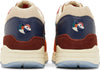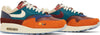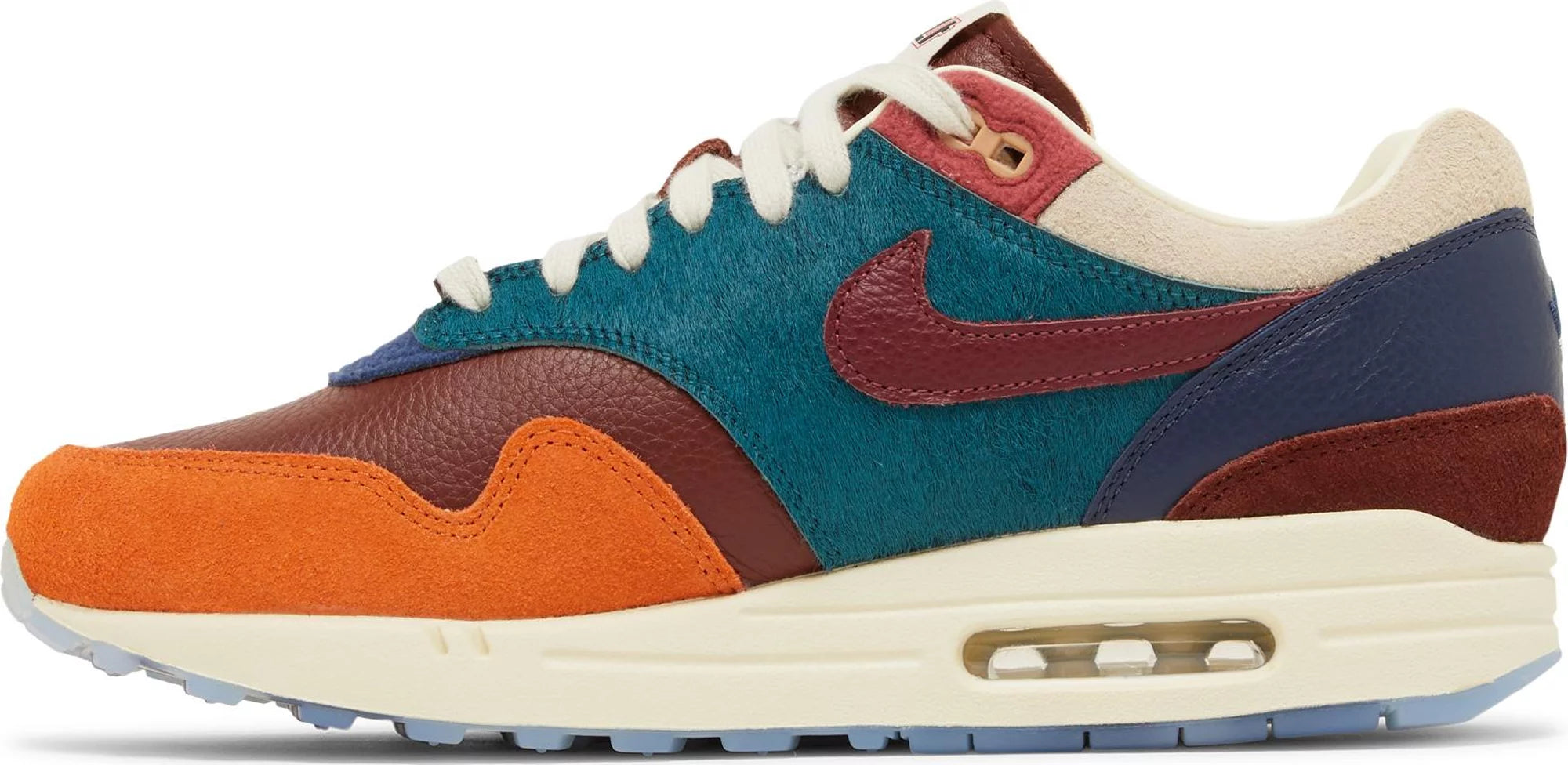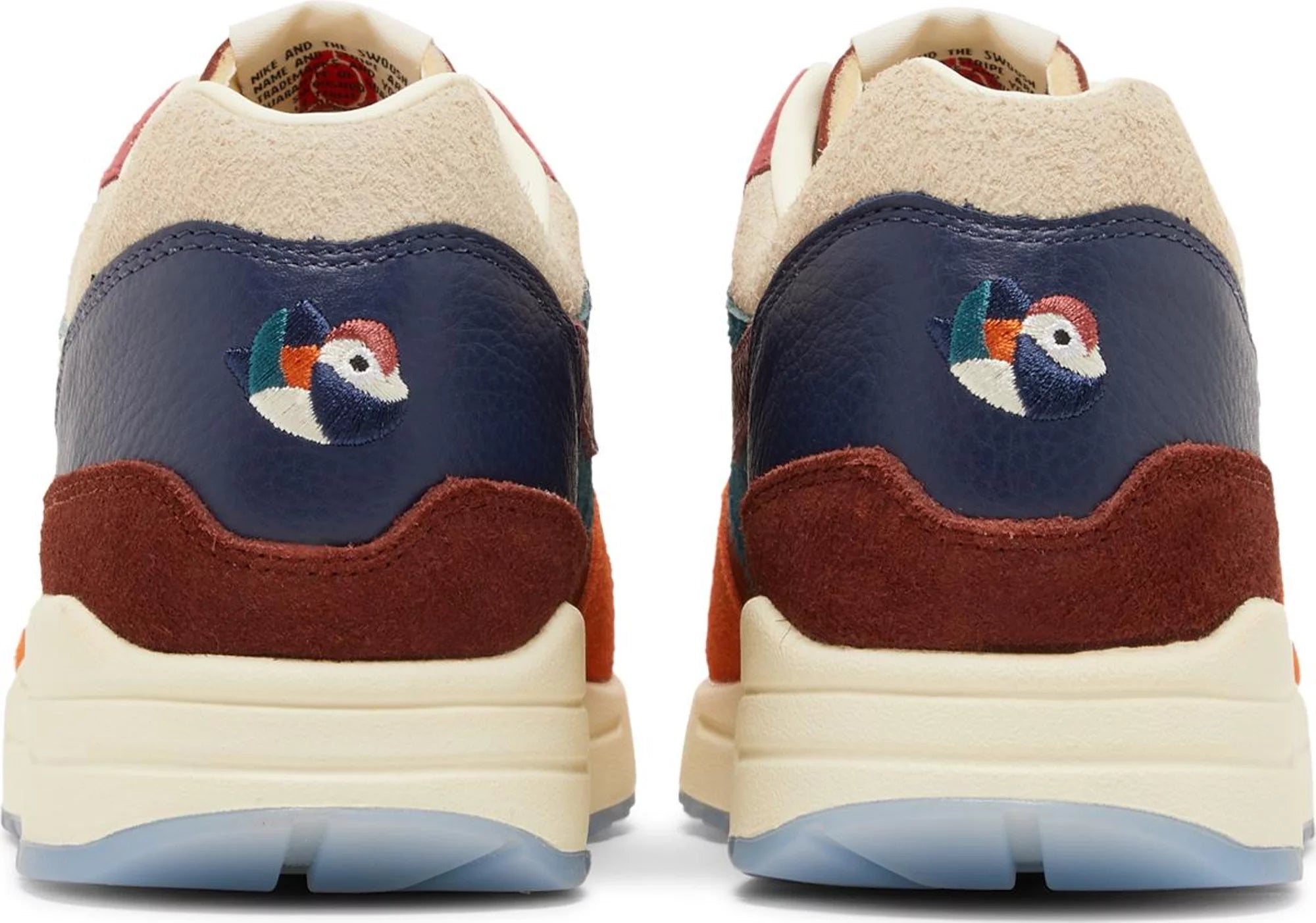 The Kasina x Nike Air Max 1 SP ‘Won-Ang Orange’ features a unique design centered around the Mandarin duck that gives the shoe its name. Symbolizing unity and togetherness in Korean culture, the ‘Wong-Ang’ appears via an embroidered graphic on the back heel of the upper. The mixed-material build combines a brown leather toe box, a rust-colored hairy suede mudguard, feathery pony-hair quarter panels in dark teal, and mismatched leather Swooshes in off-white and brown. Unique branding elements include a floral Swoosh on the lateral forefoot and woven tongue tags that display ‘Kasina’ in Korean lettering. Underfoot, an oversized duck graphic decorates the translucent rubber outsole.