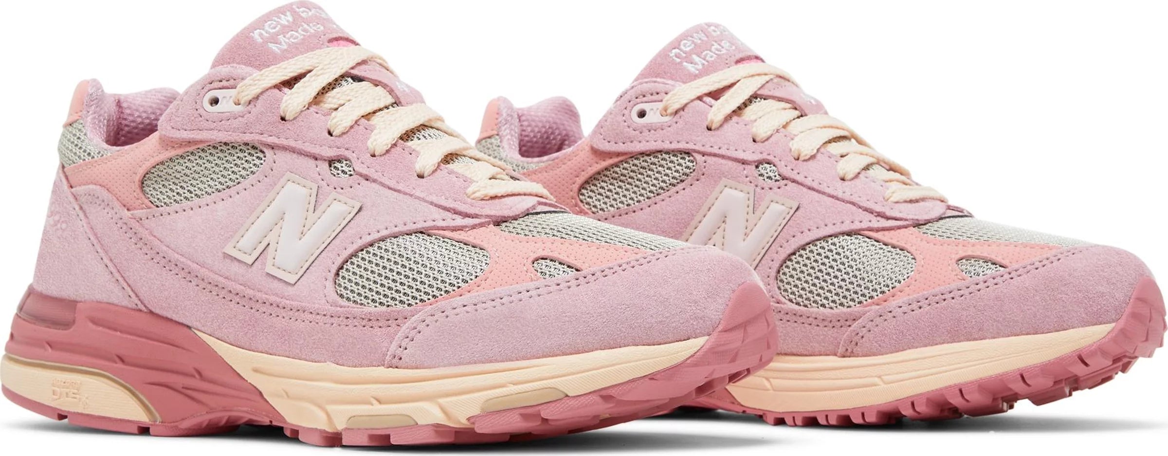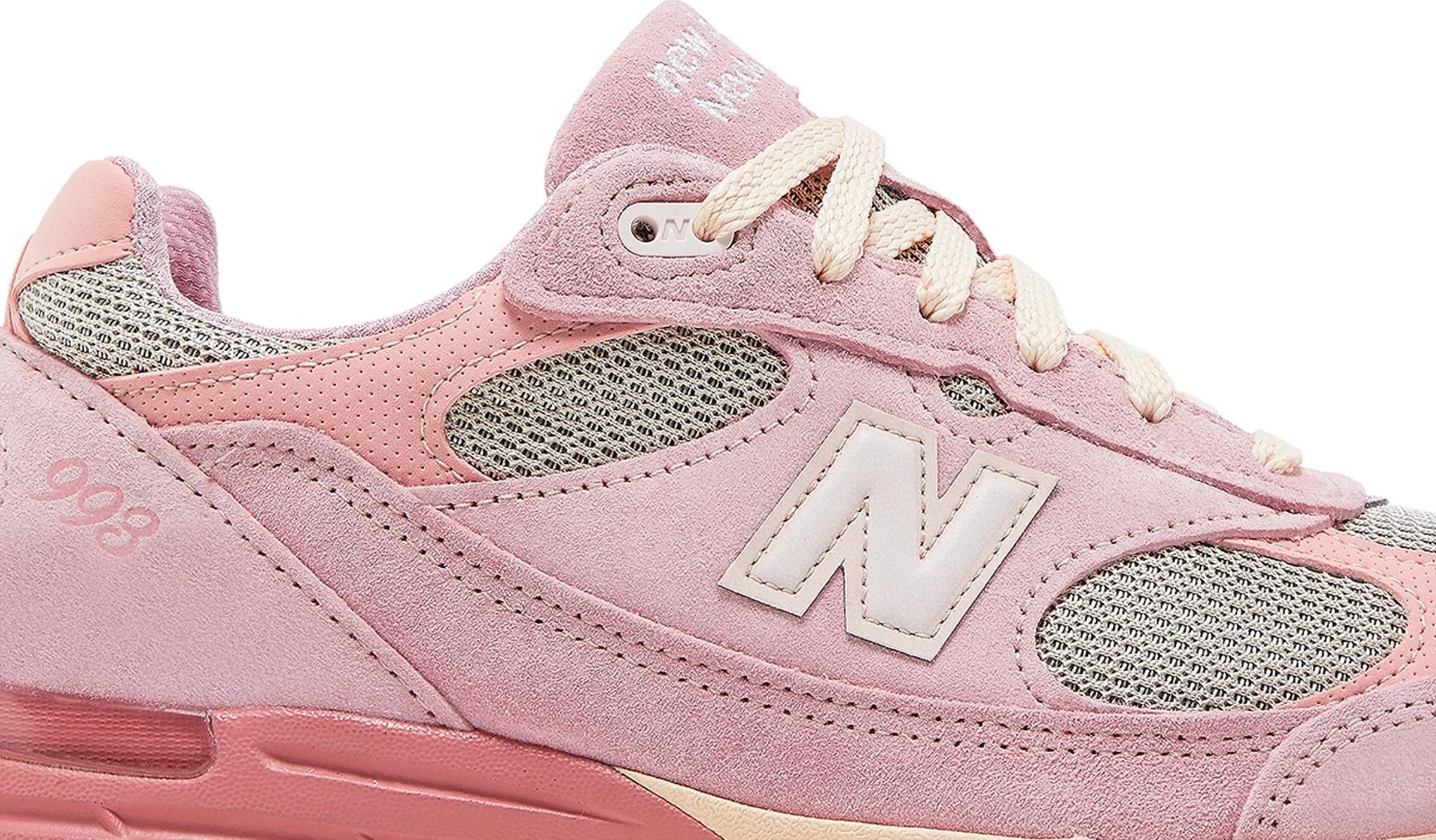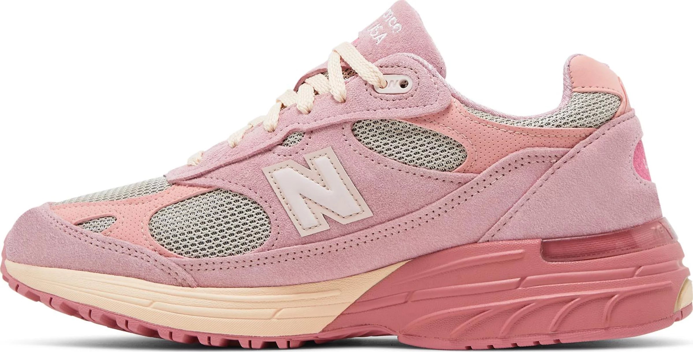 Reuniting the Chicago-based designer with the New England sportswear brand, the Joe Freshgoods x New Balance 993 Made in USA ‘Powder Pink’ is taken from the ‘Performance Art’ pack, featuring a trio of pastel colorways in elevated builds. This pair sports an airy grey mesh upper with suede and nubuck overlays in subtle shades of pink, A reflective ‘N’ logo graces the quarter panel, while JFG branding appears on the back heel. The sneaker is mounted on a two-tone ABZORB midsole, offering a comfortable ride through a blend of cushioning and compression resistance.