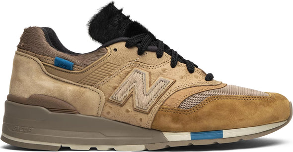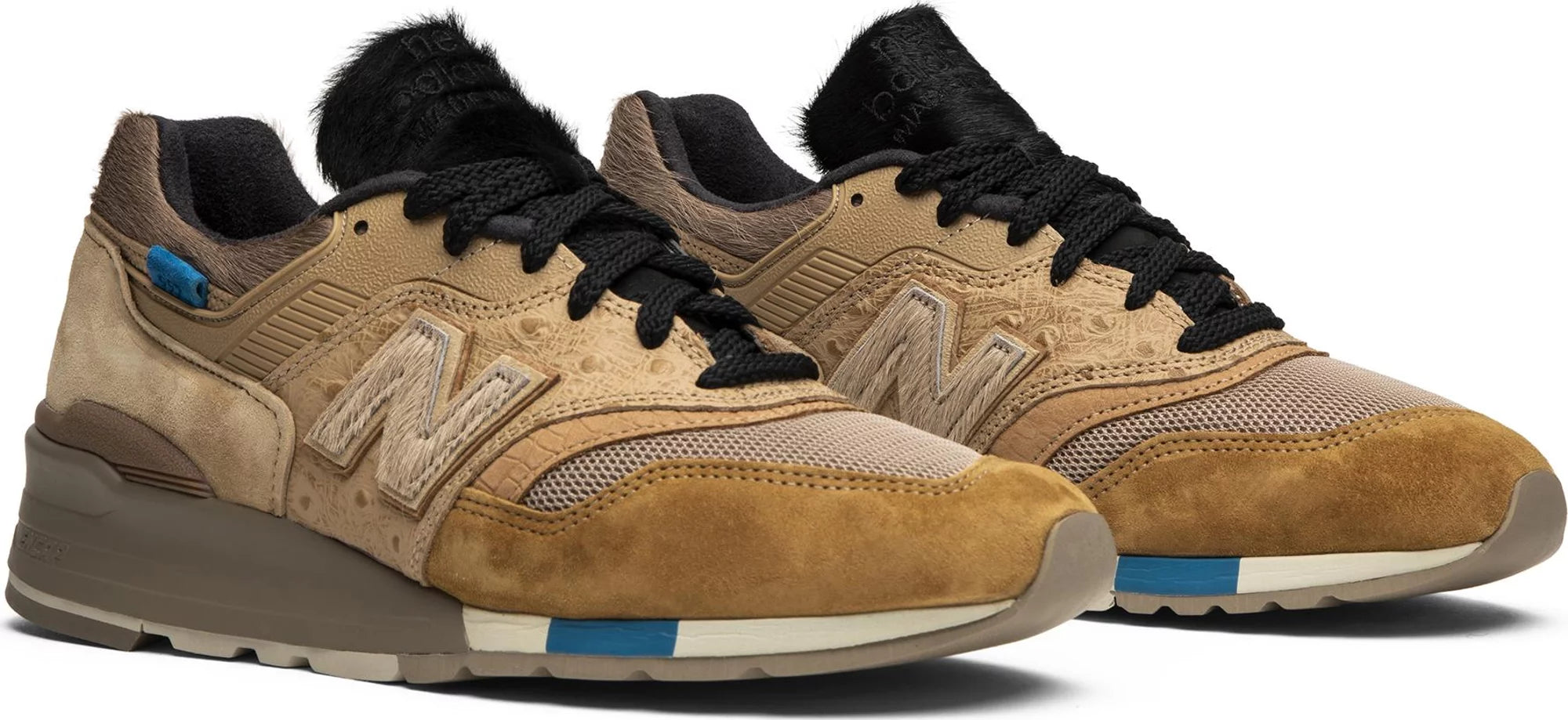 Kith partnered with New Balance and Japanese retailer nonnative for an exclusive capsule that celebrates one of Ronnie Fieg’s favorite NB styles ever made: the 997.5. This iteration borrows design details from the original and places them onto the 997 silhouette while keeping the general tan and Cobalt Blue color palette intact. The runner revamps the typical mesh and suede formation by adding pony hair applications on the tongue, heel and ‘N’ branding. The three different colors on the saddle pay homage to the three partners involved in the collaborative project.