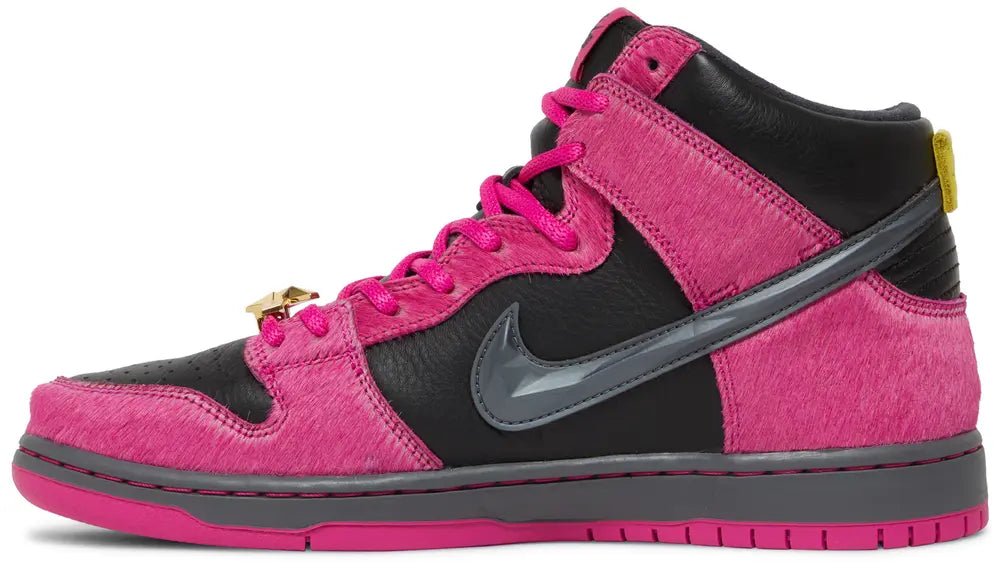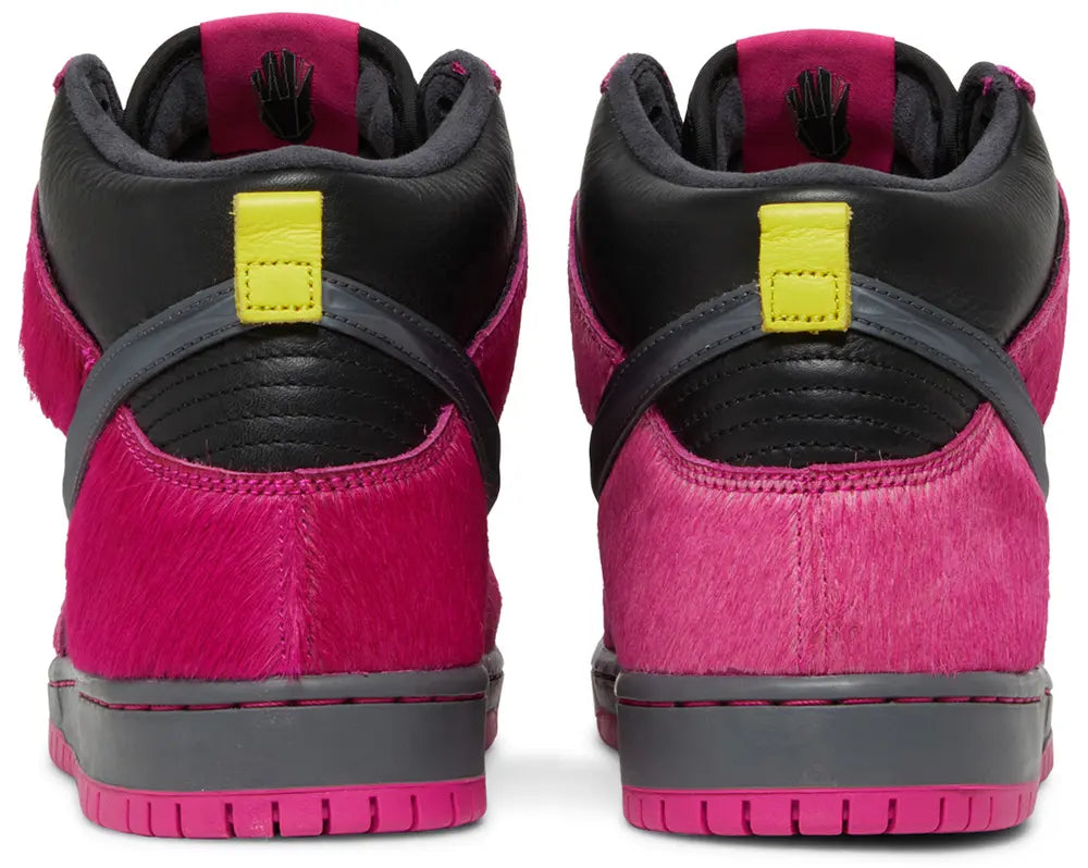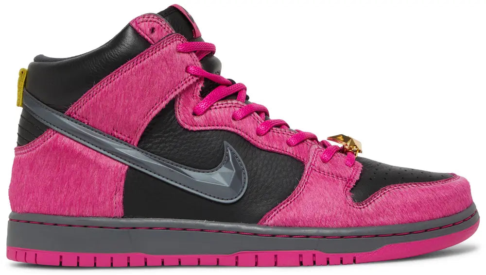 The Run The Jewels x Nike Dunk High SB ‘4/20’ pays tribute to the influential hip-hop duo formed by El-P and Killer Mike. Their dynamic sound is reflected in the shoe’s contrasting colors and textures, highlighted by a black tumbled leather upper with pony-hair overlays in a bold shade of fuchsia. The black signature Swoosh features a sculpted and polished exterior, while lace dubrae shine in metallic gold. Hidden details include a ‘Run The Jewels’ print inscribed on the inside of each collar flap and a stash pocket on the interior tongue. The high-top is mounted on a rubber cupsole that pairs black sidewalls with a fuchsia outsole.