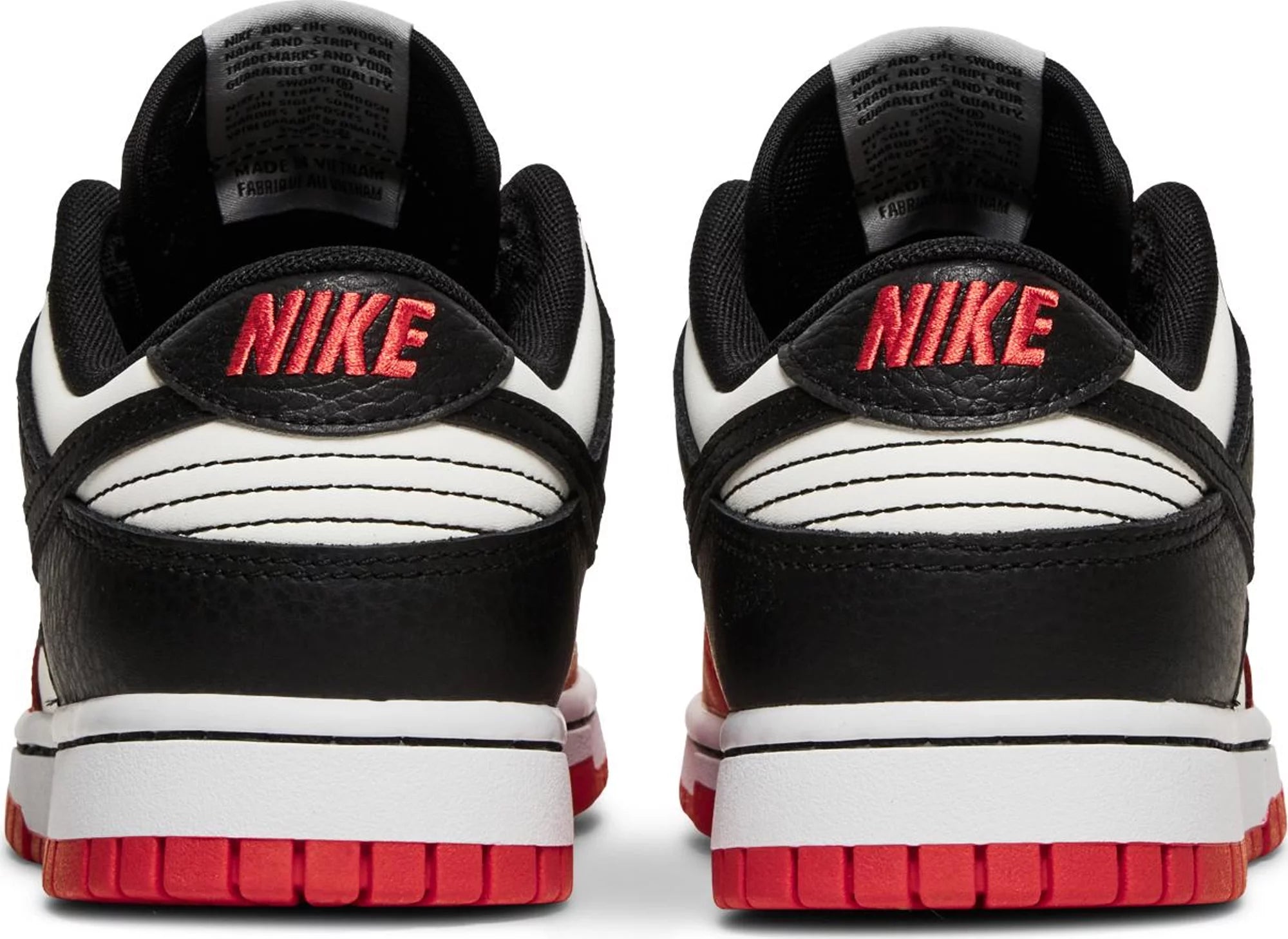 The Nike Dunk Low EMB ‘Bulls’ celebrates the NBA’s 75th anniversary with a familiar color scheme inspired by the league’s storied Chicago franchise. The all-leather upper combines a crisp white base with forefoot and heel overlays in Chile Red and black. Branding elements include a black leather Swoosh, a woven 75th anniversary tongue tag, and a crimson Nike wordmark embroidered on the heel tab. A diamond graphic is etched on a pair of metallic lace dubrae in an overt nod to the NBA’s diamond anniversary.