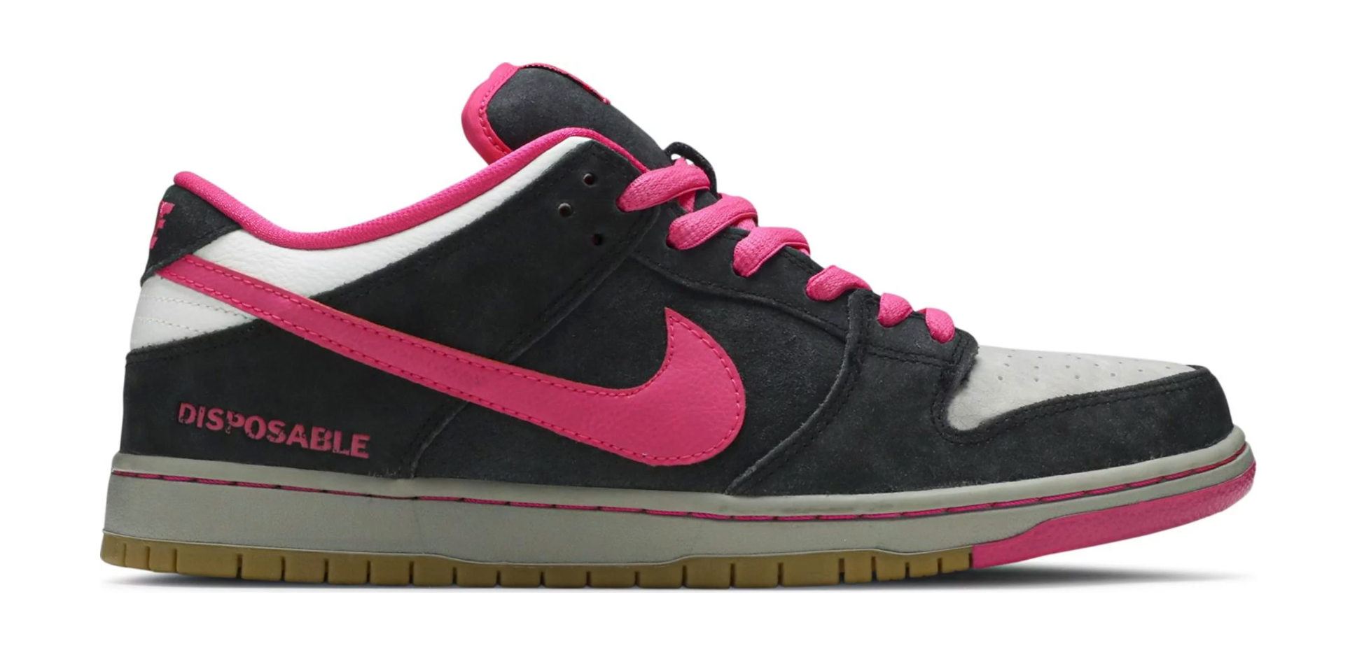 In 2004, Sean Cliver released Disposable: A History of Skateboard Art, a book that looks at how art and skateboard culture have evolved in tandem over the years. In honor of the book’s 10th anniversary, Nike released the Dunk Low Premium SB Qs 'Disposable.’ The low top boasts a black suede upper with matching grey overlays, Pink Foil details, and “Disposable” heel branding.