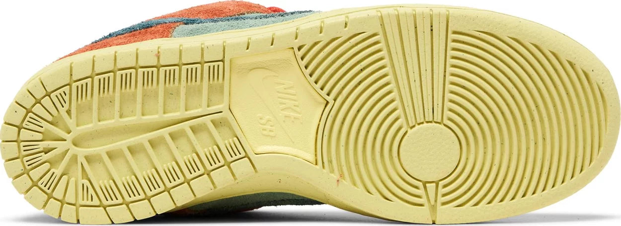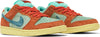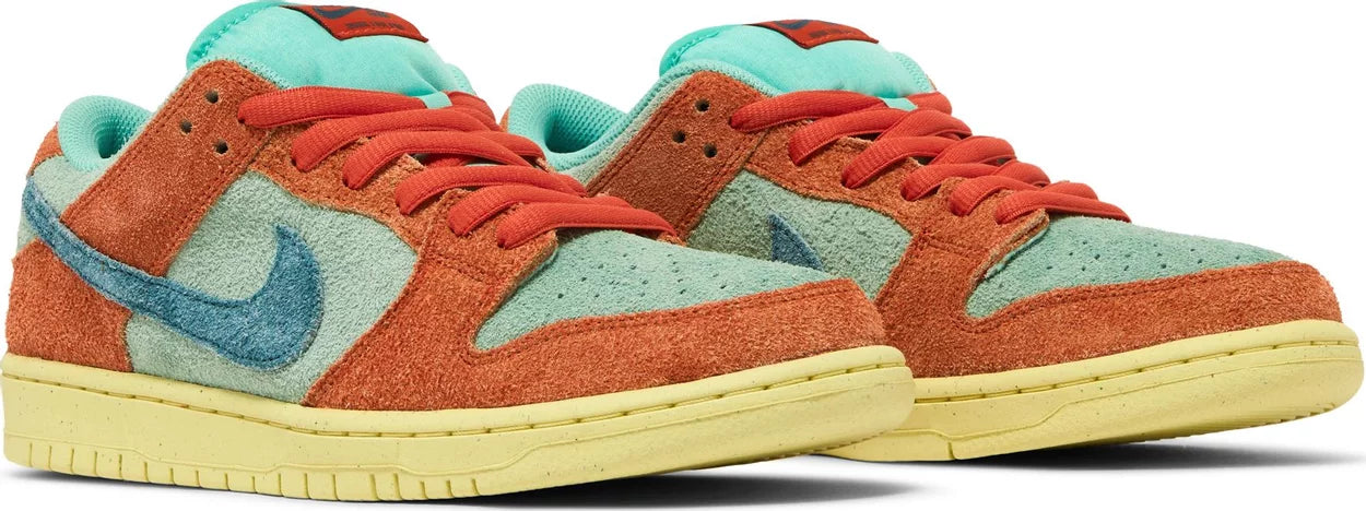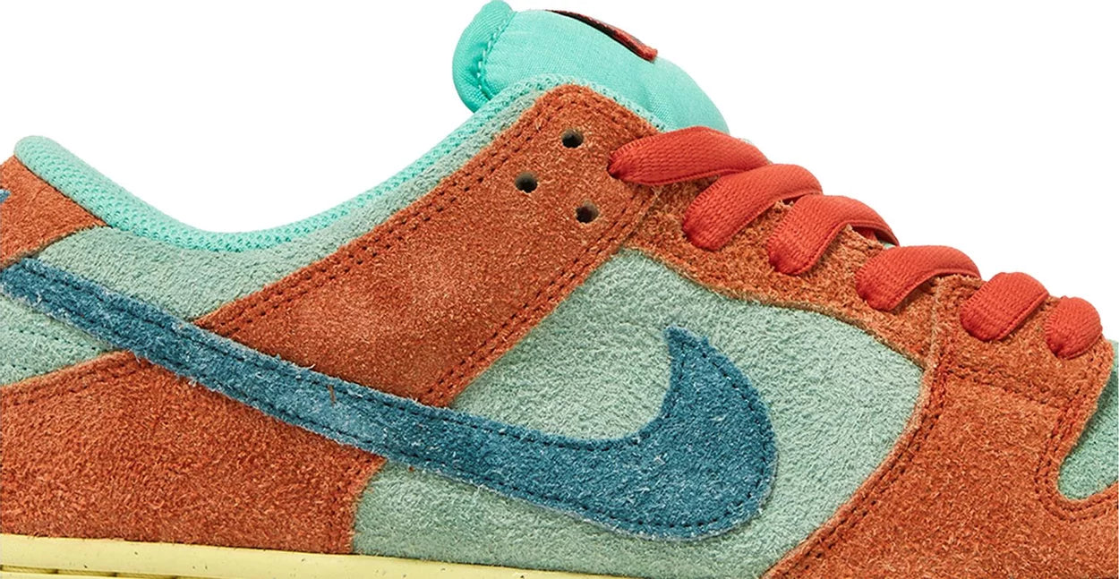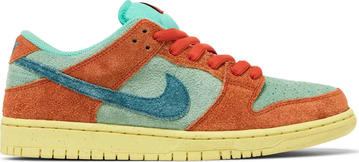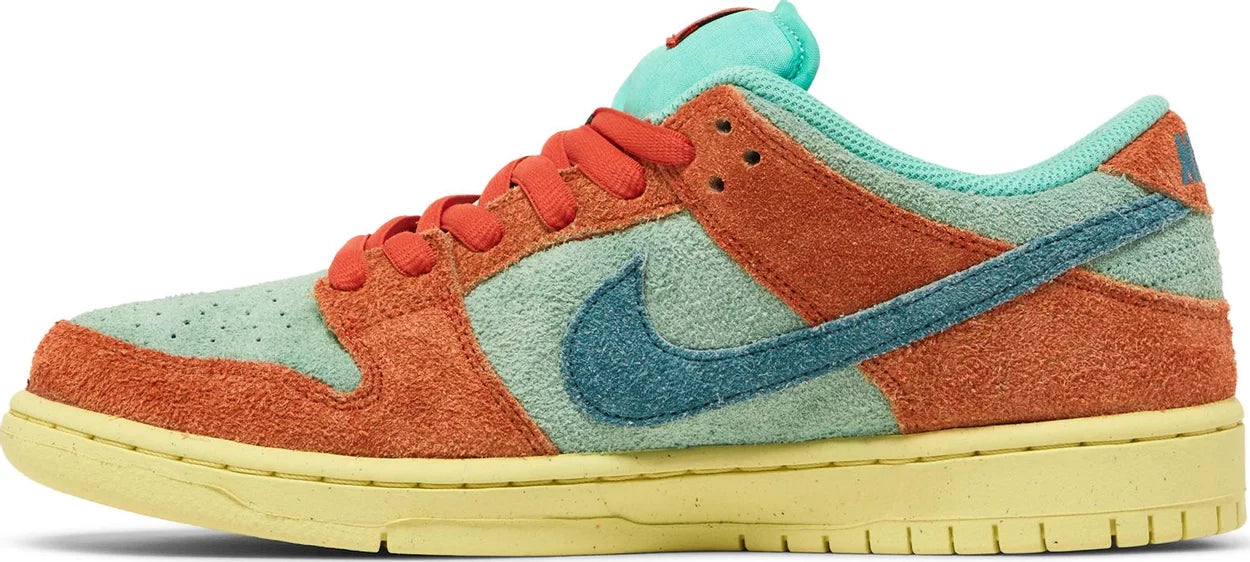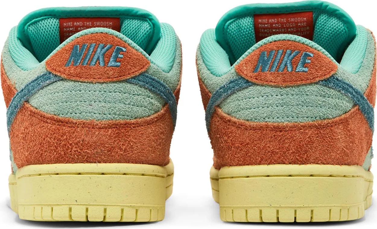 The Nike Dunk Low SB ‘Orange Emerald Rise’ showcases hairy suede on the upper, featuring a base color in Emerald Rise with contrasting orange overlays at the forefoot and heel. The signature Swoosh appears in aqua blue suede, matching the Nike logo hits that adorn the tongue tag and back tab. The insole packs a Zoom Air unit in the heel for impact protection. Underpinning the sneaker is a durable rubber cupsole in Lemon Chiffon.