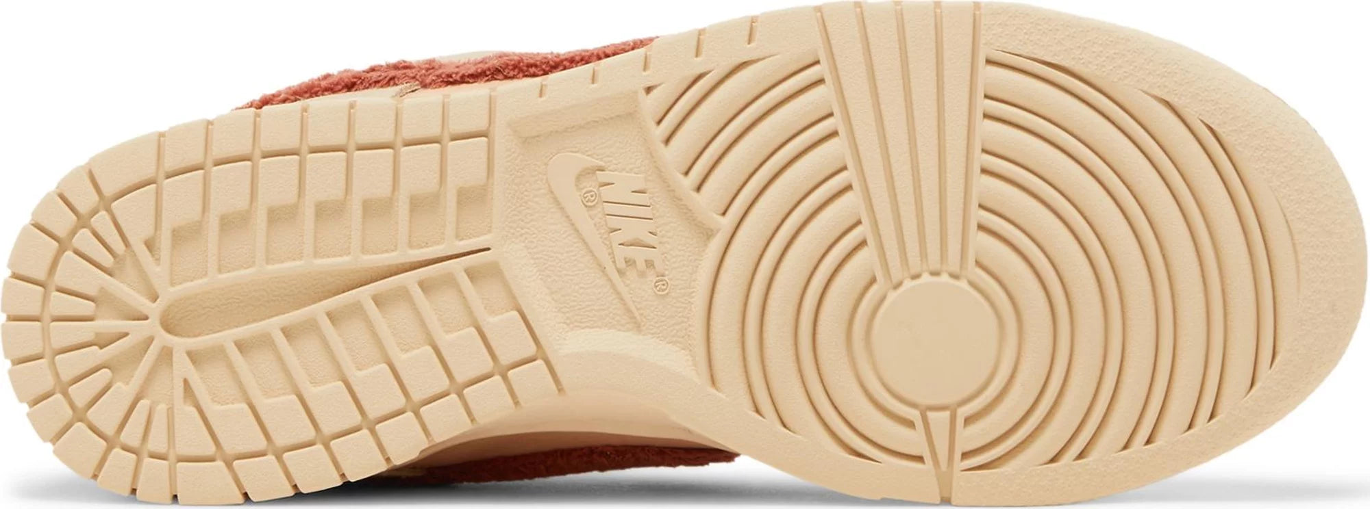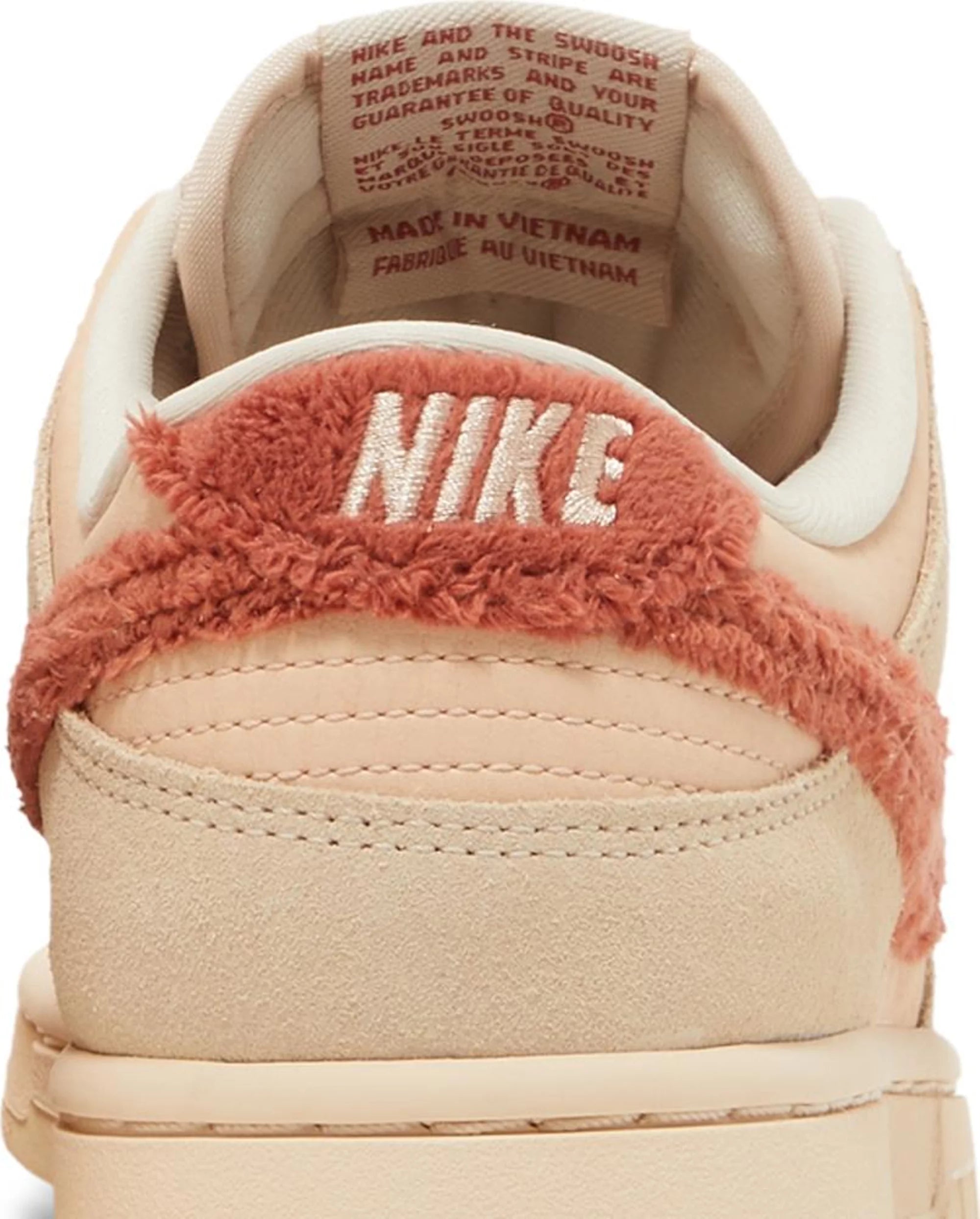 The Nike Women’s Dunk Low ‘Terry Swoosh’ makes over the heritage silhouette with muted tones and cozy materials. A faded red hue is applied to the Nike-branded heel tab and signature Swoosh, both built with fuzzy terry cloth. The plush details stand out against a backdrop that combines a subtle pink leather base with sand-colored suede overlays at the forefoot and heel. A standard woven Nike tag adorns an updated tongue in terry fleece. The low-top rests on a durable rubber cupsole in a solid beige finish.