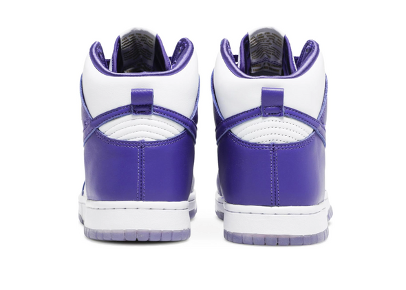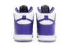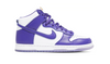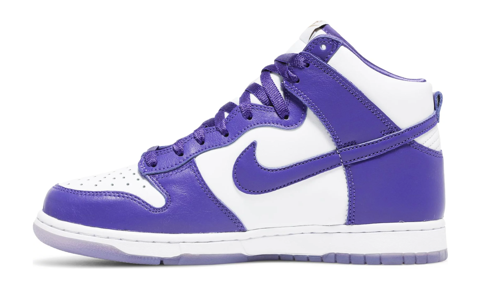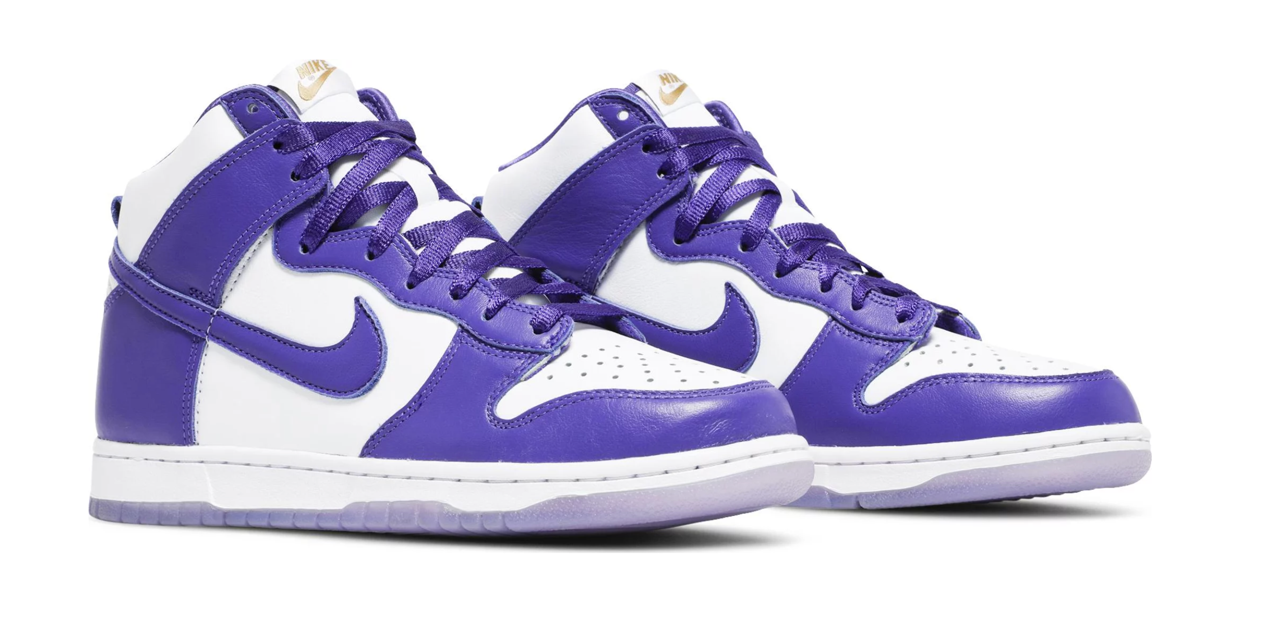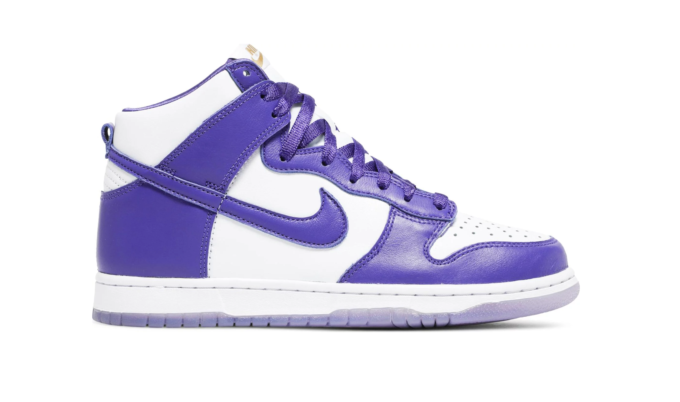 The Nike women’s Dunk High ‘Varsity Purple’ draws inspiration from the CO.JP ‘City Attack’ pack, released exclusively in Japan in 1999. Like the older colorway, this pair makes use of an all-leather upper that pairs a crisp white base with contrasting violet overlays. Gold Nike branding on the woven tongue tag is similarly carried over from the original. Refreshed details include satin laces, a satin lining on the collar and tongue, and a lavender-tinged translucent rubber outsole.