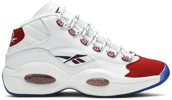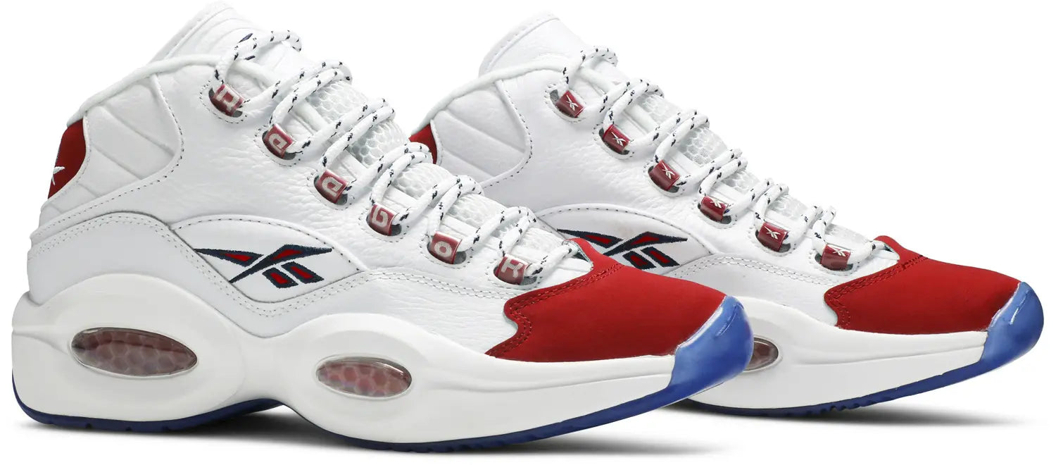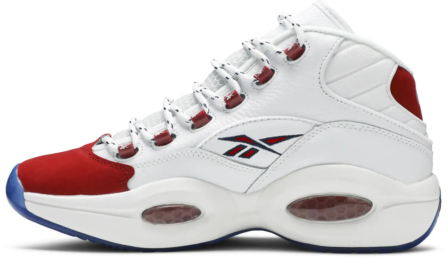 The 2020 reissue of the Reebok Question Mid OG ‘Red Toe’ brings back Allen Iverson’s debut signature shoe. Dressed in the colors of the Philadelphia 76ers, the build is faithful to the original, featuring a premium white leather upper with a red suede toe cap — a detail that distinguishes the sneaker’s first 5,000 units, before Reebok switched to leather in subsequent production runs. Visible Hexalite cushioning is highlighted on the midsole, reinforced underfoot by an icy blue translucent outsole.
