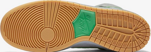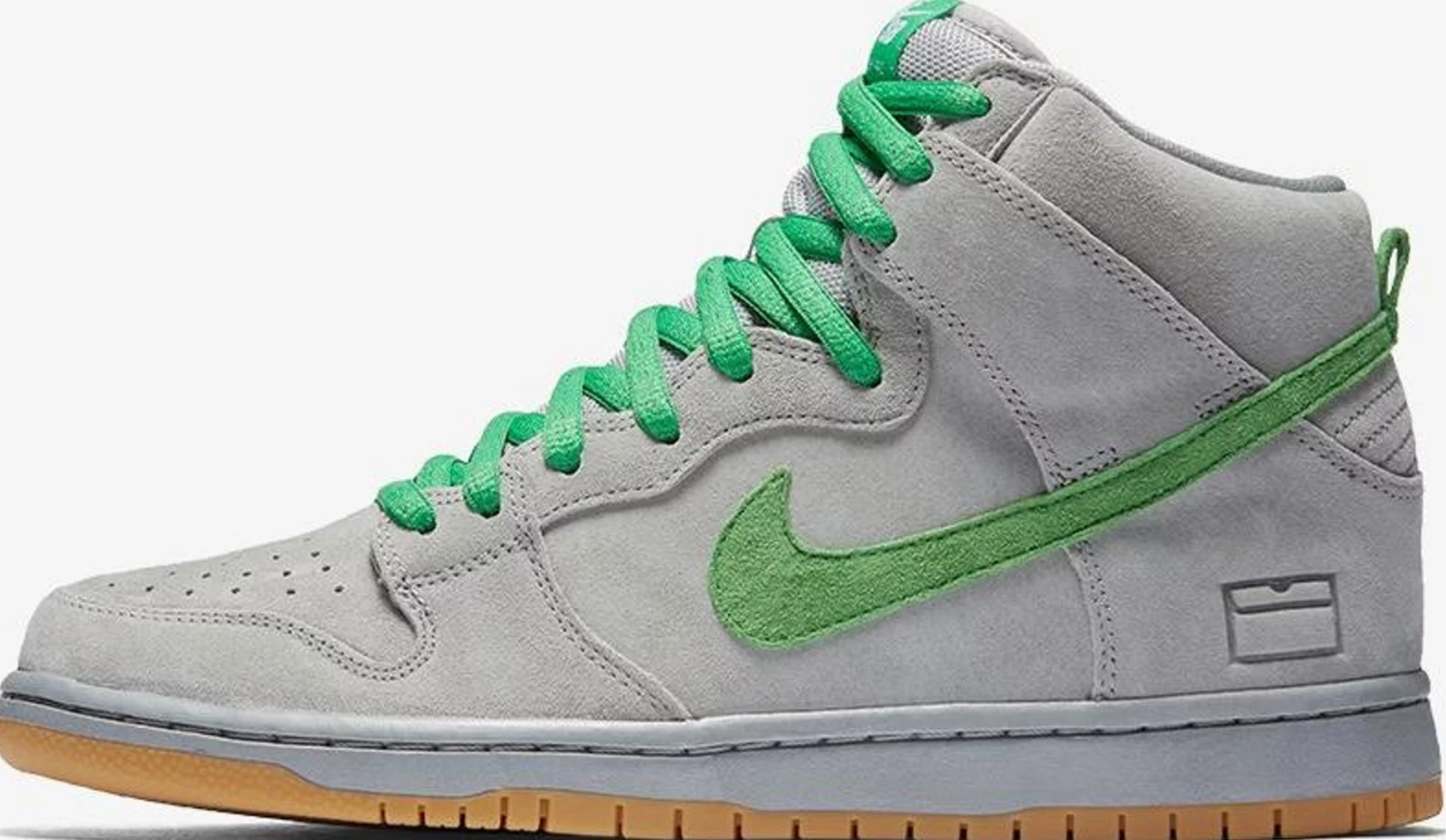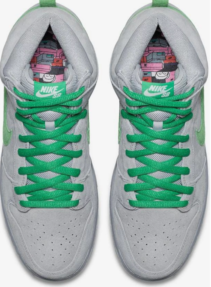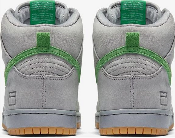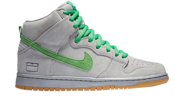 Nike SB celebrates 15 Years of Dunk with a special edition of the Dunk High. Paying tribute to the brand’s silver box era, the shoe features a silver/grey hue upper done in suede. Contrasting green accents line the Swoosh, laces, and branding, while the heel is bolstered with a shoebox icon as a nod to this particular period in SB Dunk history.