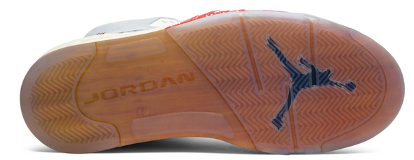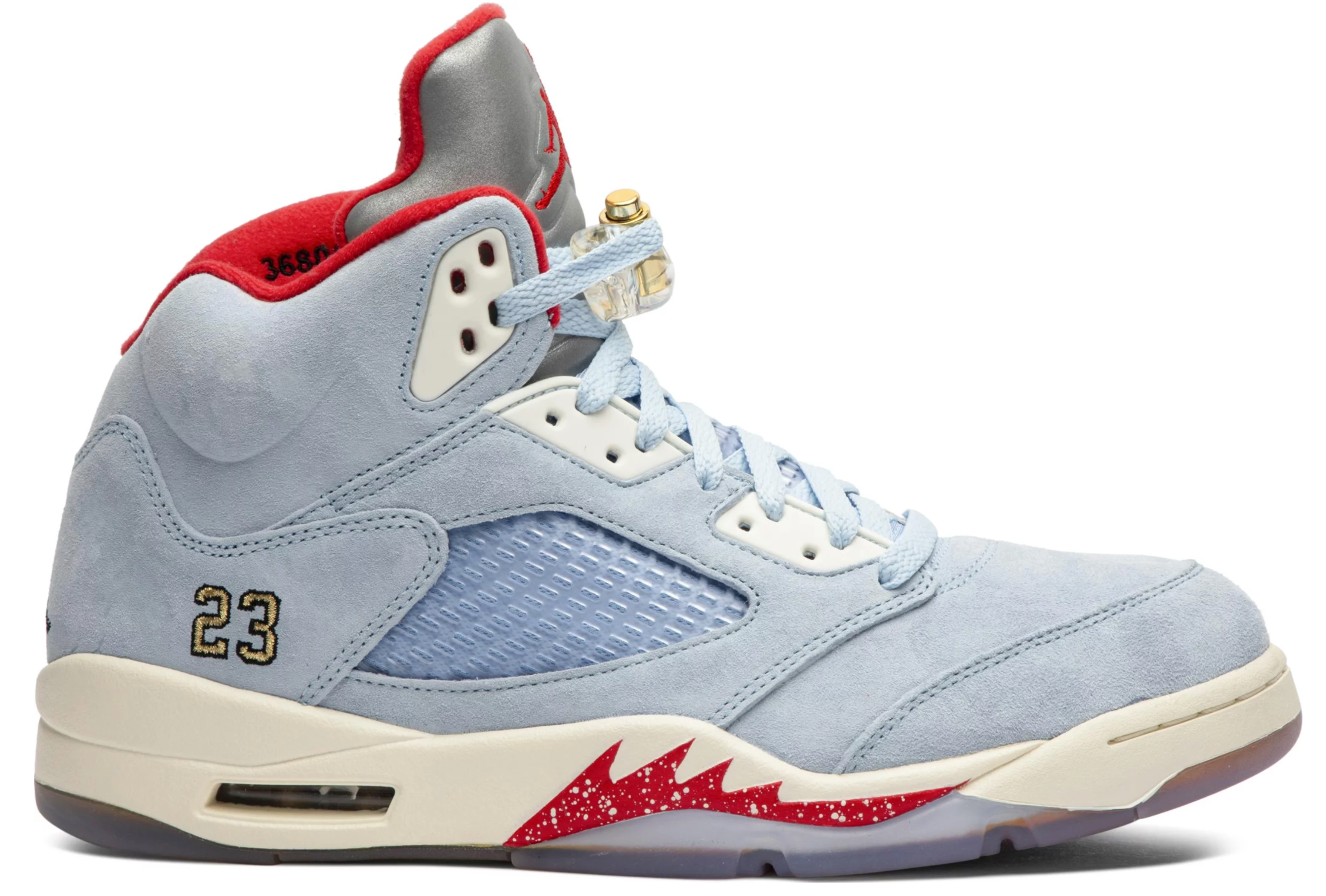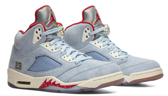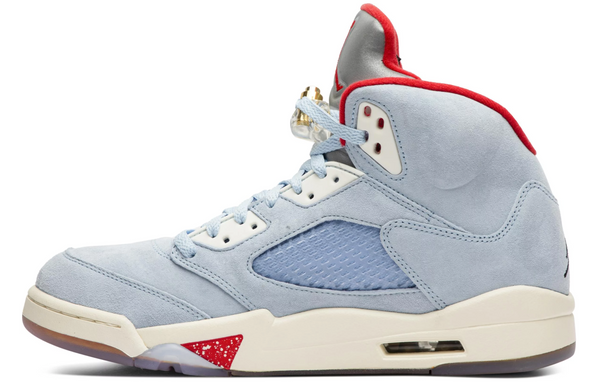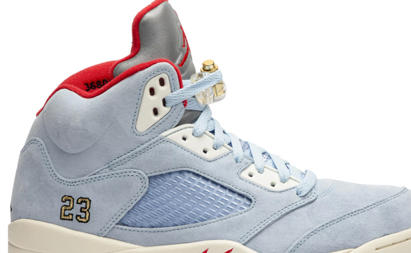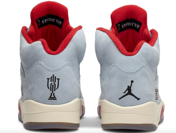 The Trophy Room x Air Jordan 5 Retro sneaker draws inspiration from the real-life trophy room in the Jordan family home. This 'Ice Blue' rendition is replete with a rich suede upper, hits of University Red, Sail and a metallic gold lace lock. Each lateral heel is embroidered with metallic gold numerals—'23' and '5'—the jersey numbers worn by MJ and his son, Marcus. Below, the sneaker's translucent rubber sole displays a wood-grain motif to reference the court-style flooring in MJ's trophy room. A total of 7,000 pairs were released in May 2019, each individually numbered.