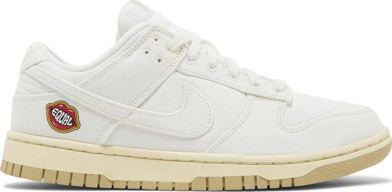 The Nike Women’s Dunk Low SE ‘The Future Is Equal’ spotlights a colorful graphic element on an otherwise blank-slate colorway of the vintage ‘80s hoops shoe. The upper is constructed from off-white canvas, accented with a screen-printed graphic on the lateral heel that reads ‘The Future Is Equal.’ The phrase is repeated on the left sockliner, while the right insole encourages wearers to ‘Make Your Mark.’ Anchoring the sneaker is a durable cupsole, featuring cream-colored sidewalls and a Team Gold rubber outsole.
